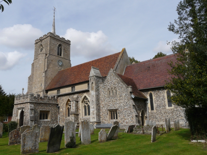 In the rather remote north-east of Hertfordshire, on top of a hill some way from most of the parish’s settlements. The chancel is 13th century and the nave and aisles 14th century. The pulpit is 18th century and the screen 15th century. There were restorations in 1855 by G.E. Pritchett and George Perry in 1868.