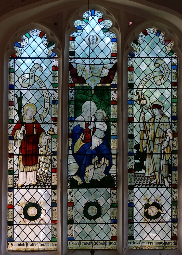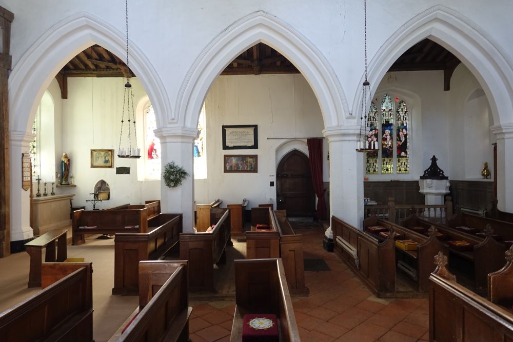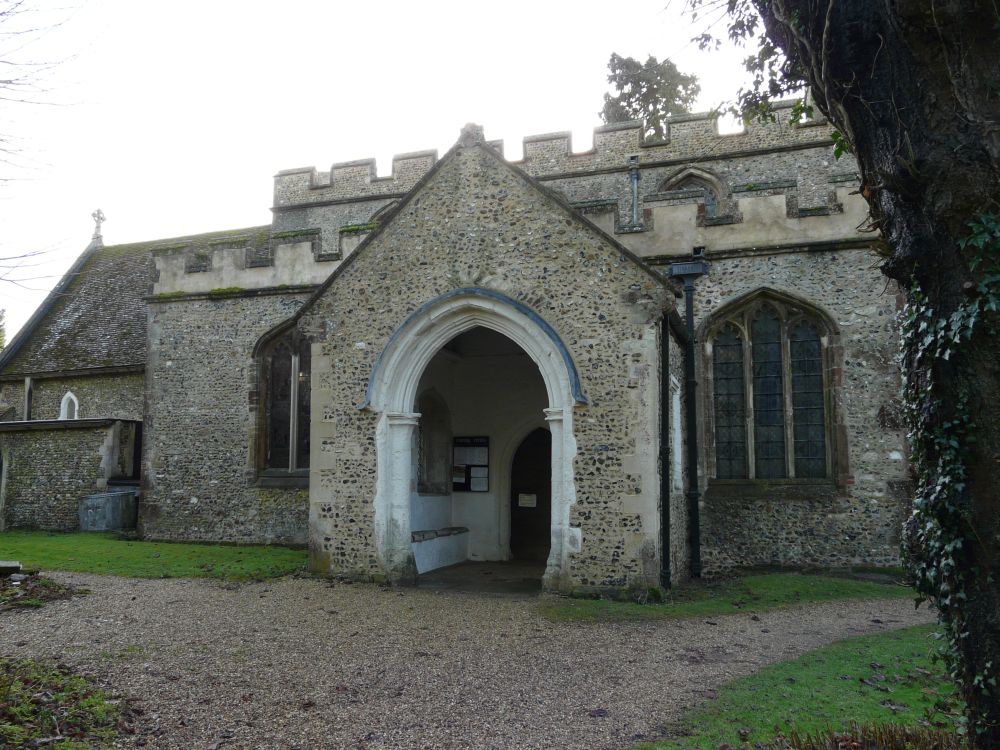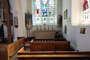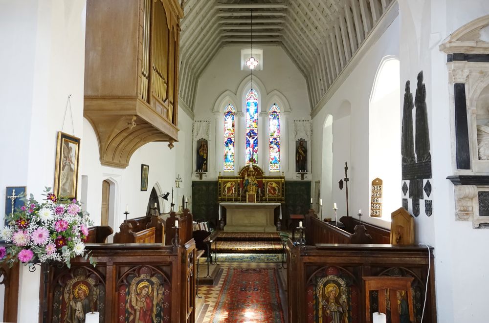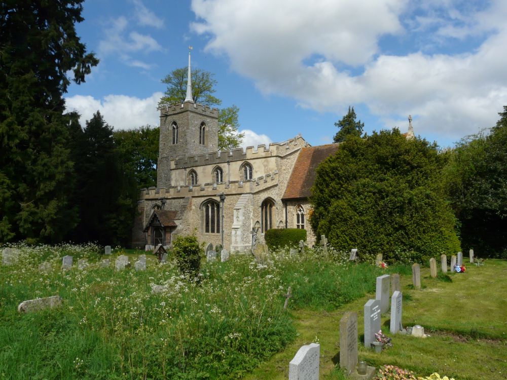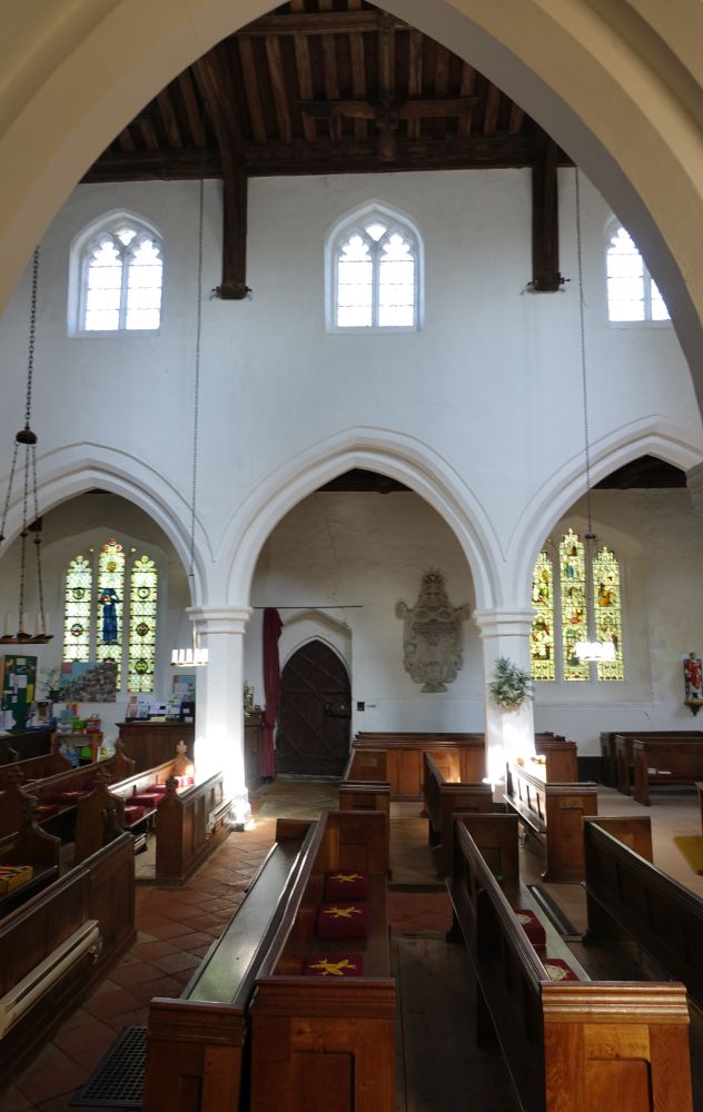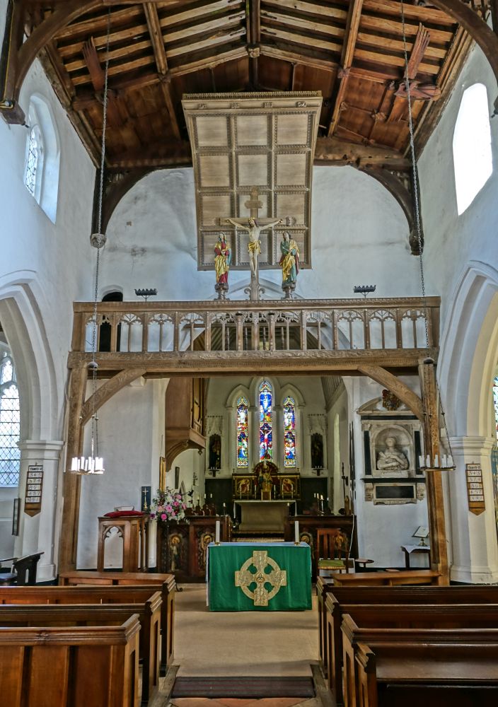 A surprisingly high church for a village church. The church features a 1920s rood and rood loft (by F.C. Eden) and six candles on the altar. Mainly 14th century, but with an earlier chancel. 19th century restoration was by Gilbert Scott in 1858 and J.T. Micklethwaite and Somers Clarke 1887-91.