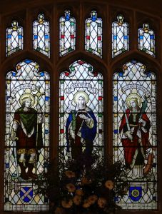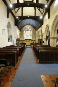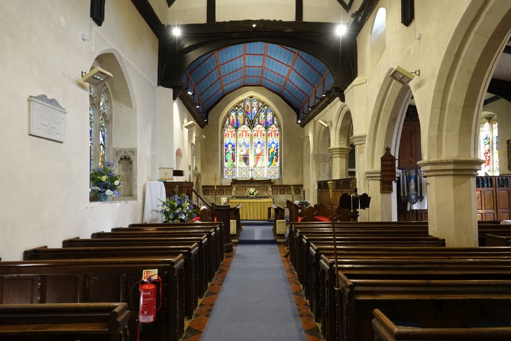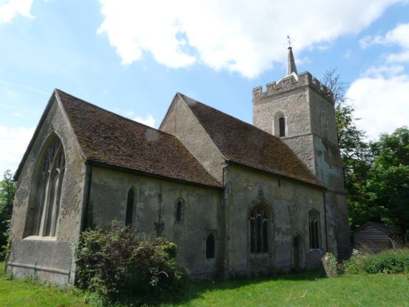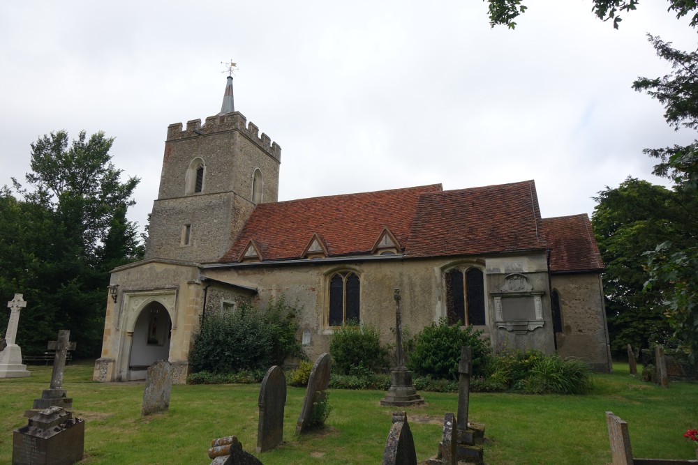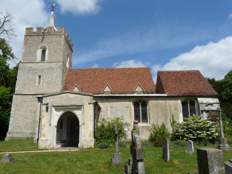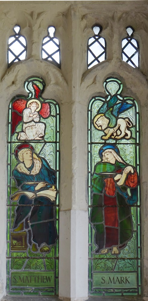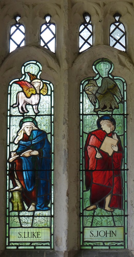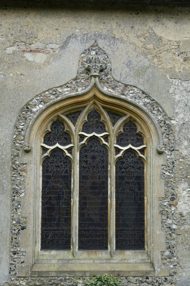 Just outside Buntingford. The church overlooks fields at the western end of the village on a dead end road. Restored in 1873 by Sir Arthur Blomfield. A south-east chapel contains box pews, and a large monument including coloured brasses which is, unfortunately, used for storage. The Morris glass illustrated first is in the unlocked porch.
