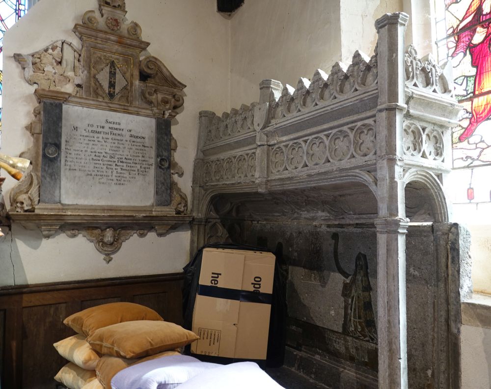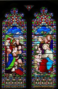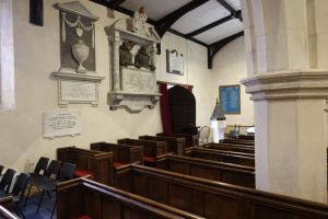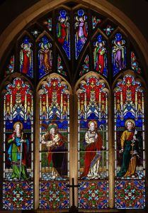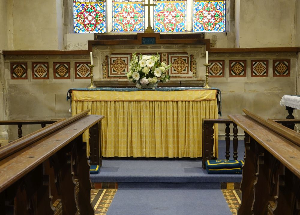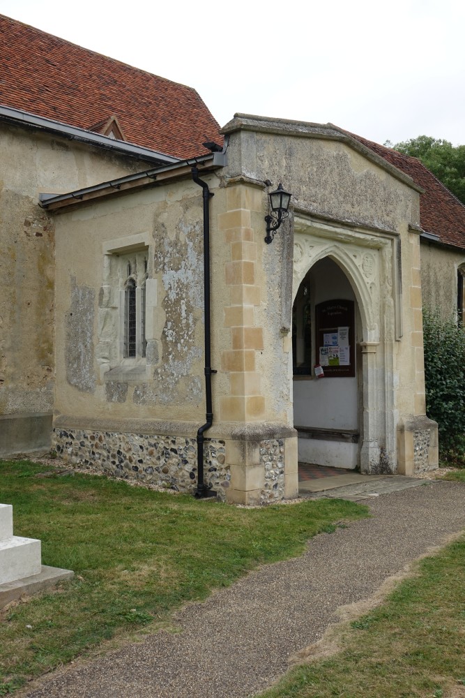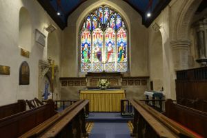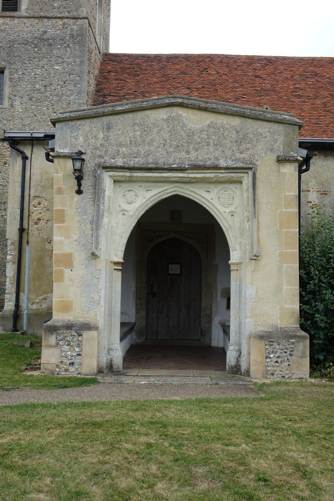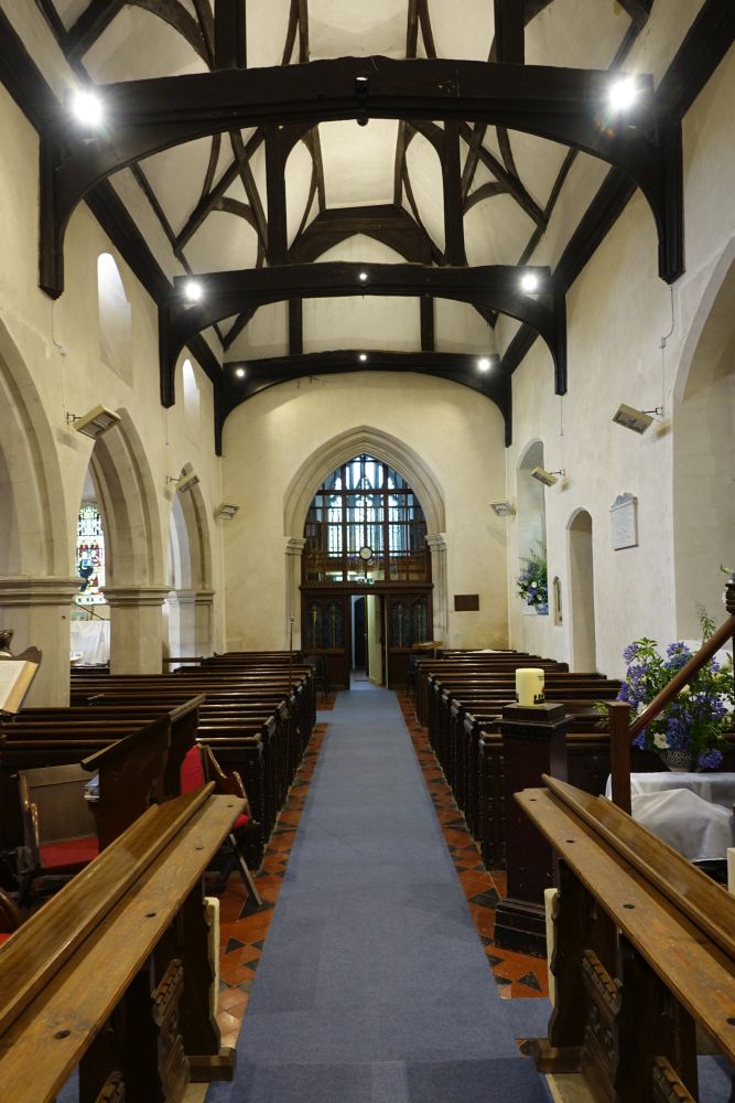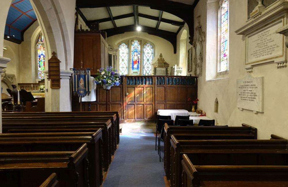 Just outside Buntingford. The church overlooks fields at the western end of the village on a dead end road. Restored in 1873 by Sir Arthur Blomfield. A south-east chapel contains box pews, and a large monument including coloured brasses which is, unfortunately, used for storage. The Morris glass illustrated first is in the unlocked porch.