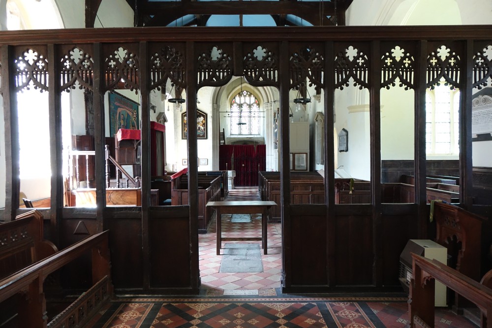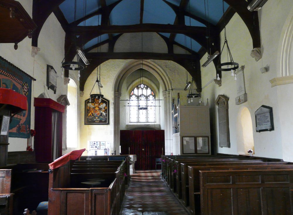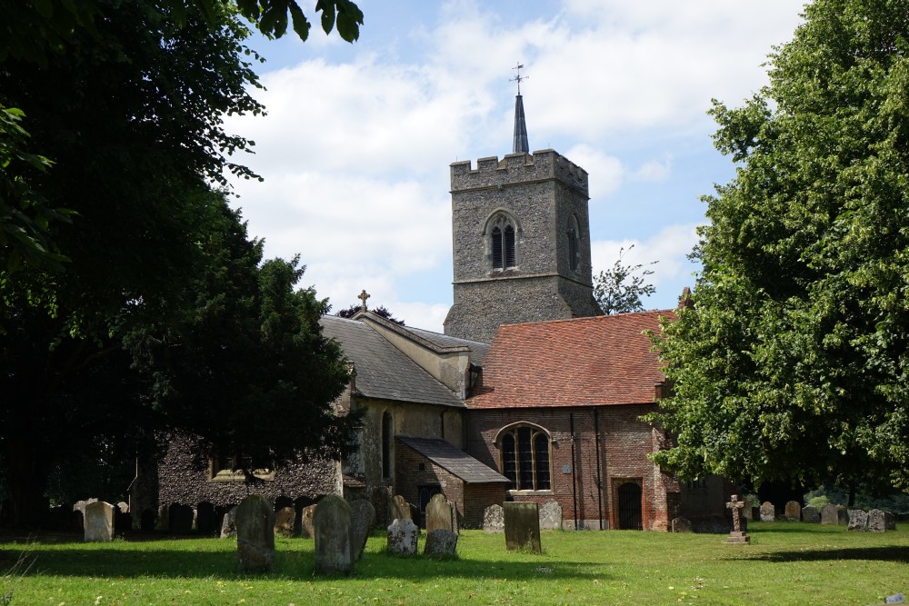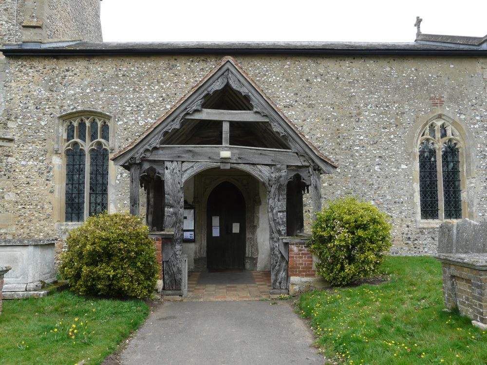 Some way from the traffic hot spot of Little Hadham crossroads outside the village near the impressive Hall. The tower is of about 1400, with a late medieval south porch and a brick built transept of the late 16th century. The interior still has some box pews and a three decker pulpit.