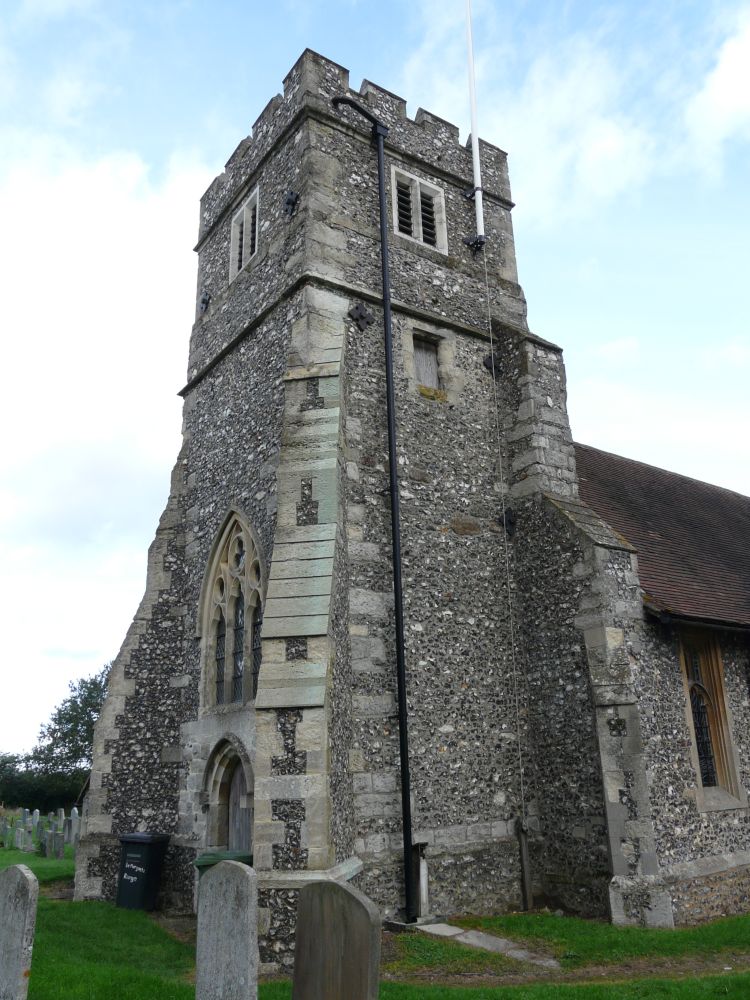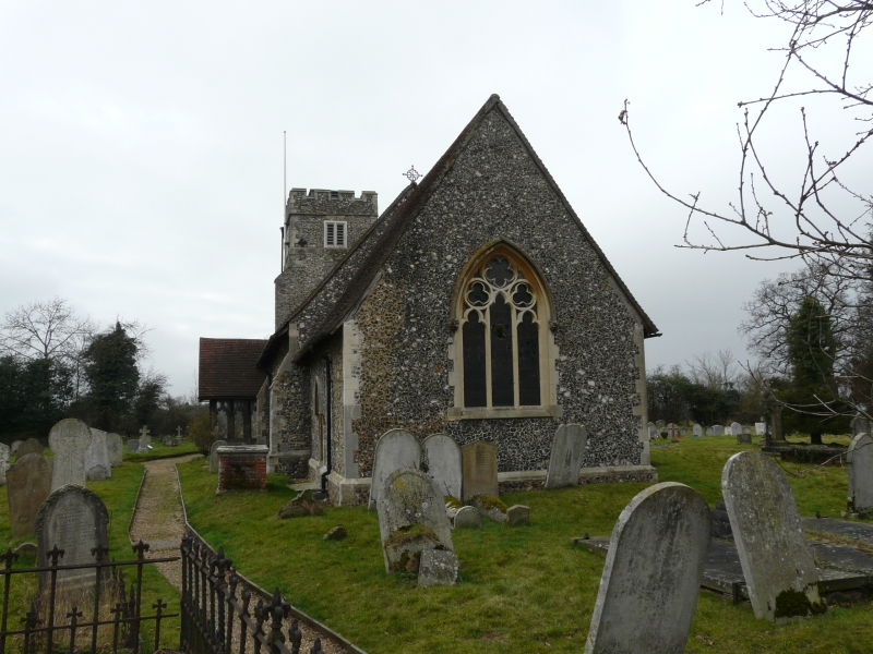 In a large churchyard in a hilltop village isolated by the M25 from much of the rest of Hertfordshire. The church is 15th century with a porch of 1881 by A. Billing. There is a large 15th century St Christopher wall painting on the north wall. At the time of visiting (October 2014) the east window was away for restoration and replaced by polycarbonate sheeting.