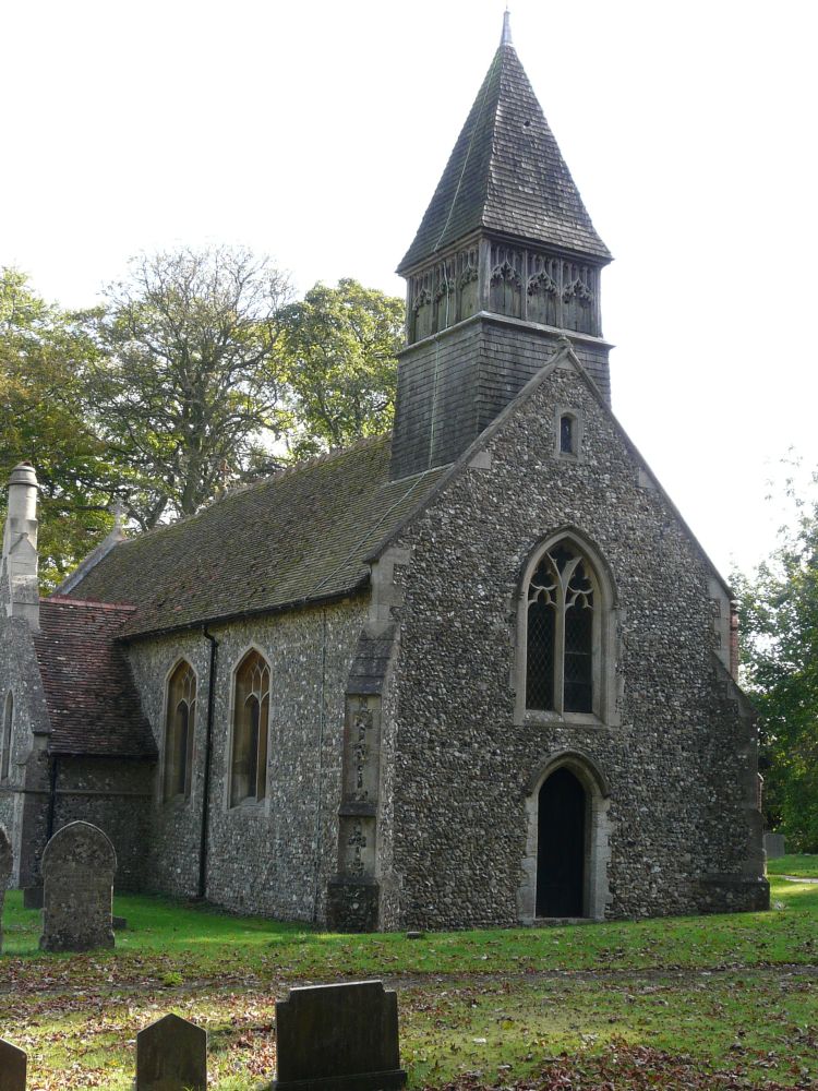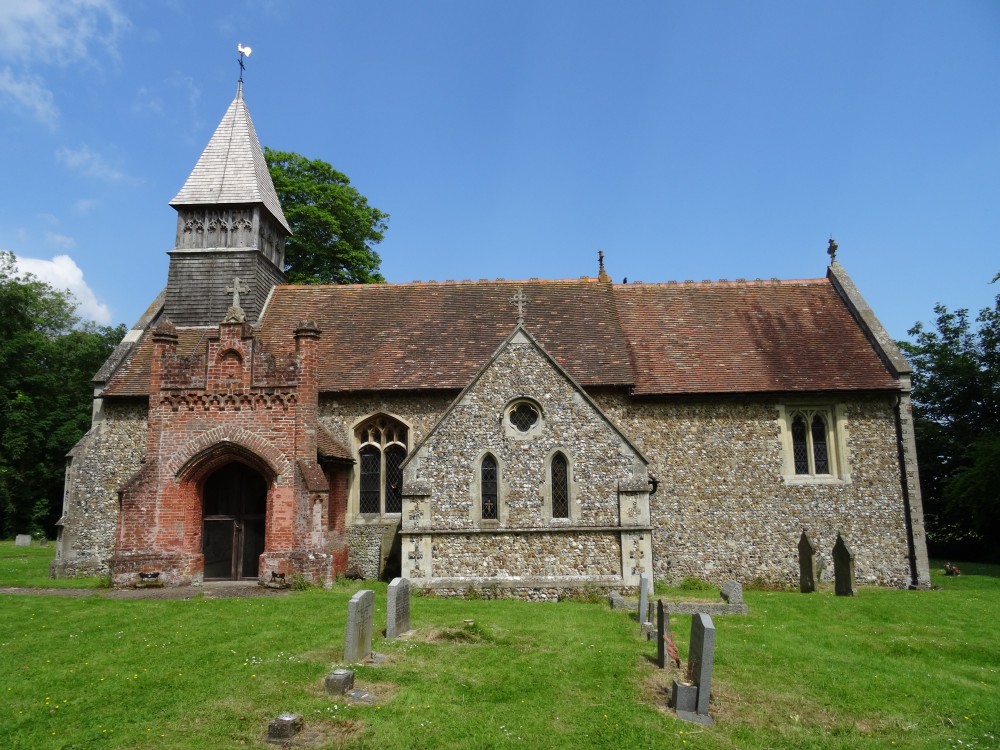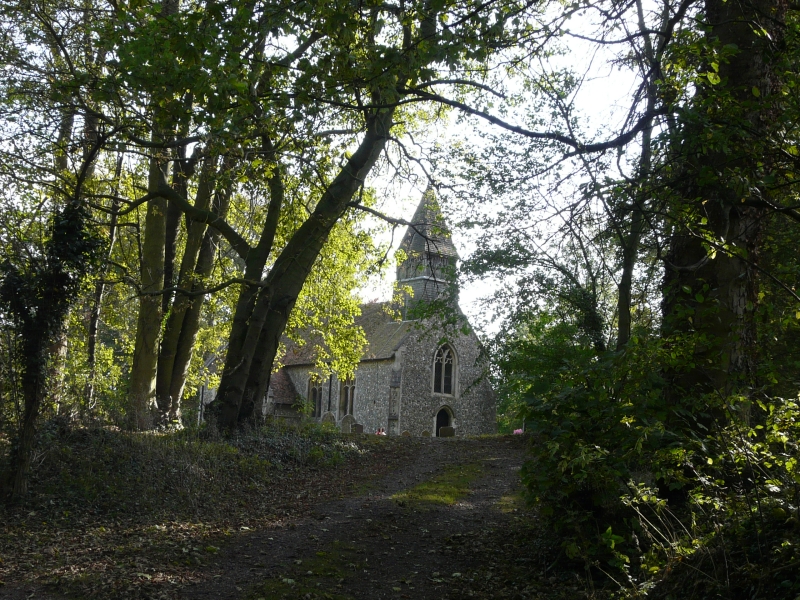 Hidden in trees, a mile east of the village, in the east of the county. The nave is 12th century, with the transepts rebuilt in 1877 and the bellcote is 19th century. The chancel is from around 1300. The remarkable brick porch dates from about 1530. The mosaic pavement around the altar dates from the 14th century.