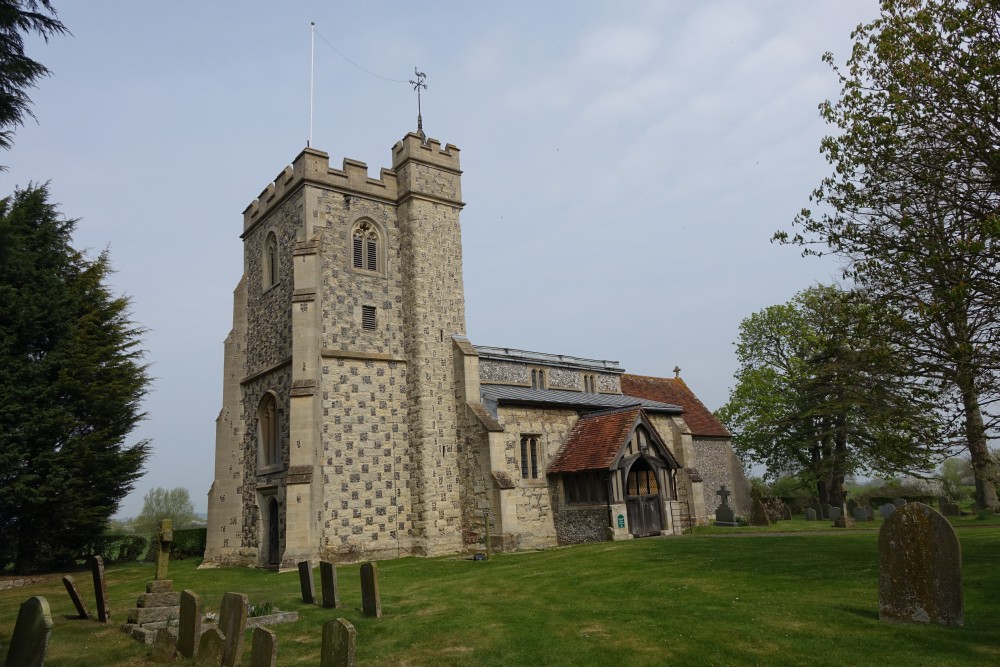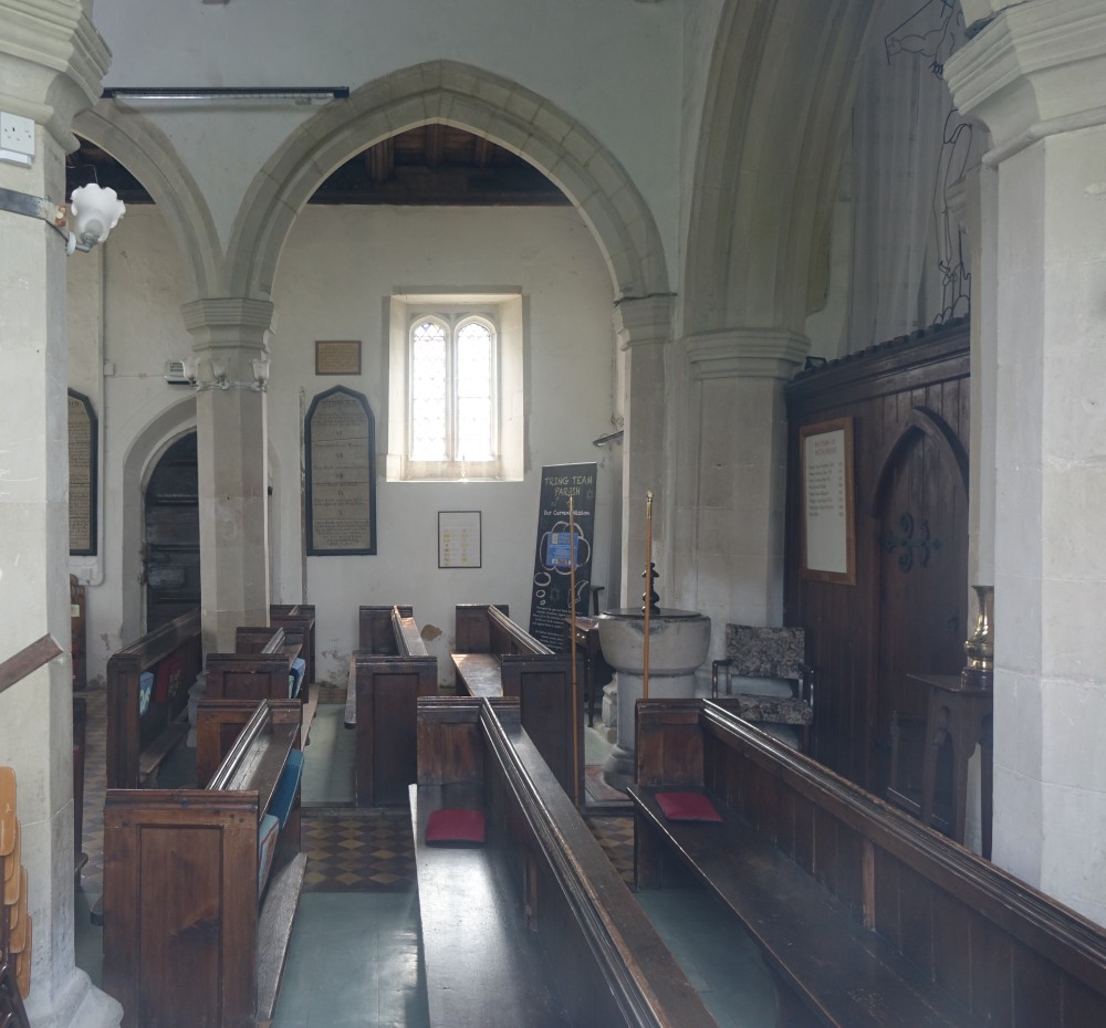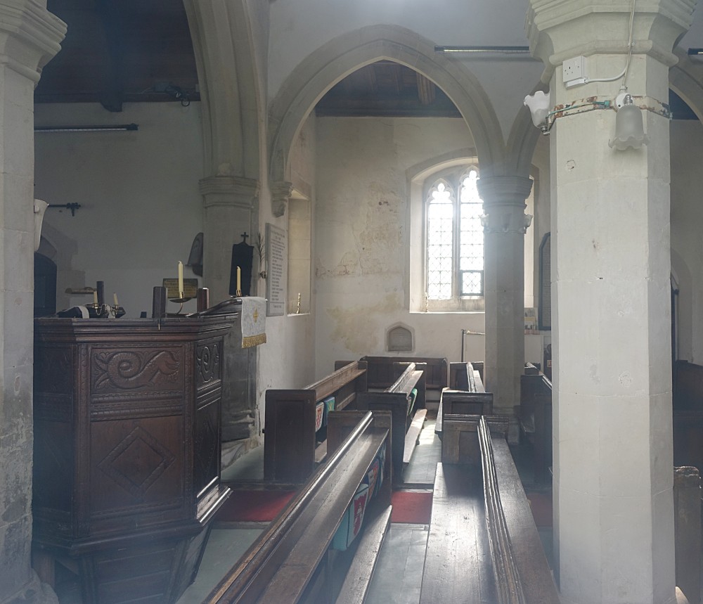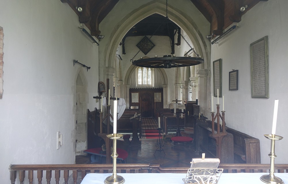 In fields at the far western edge of the county. The church dates from the 14th and 15th centuries. The interior shots are taken through the windows as the church is kept locked, hence their slight fuzziness.