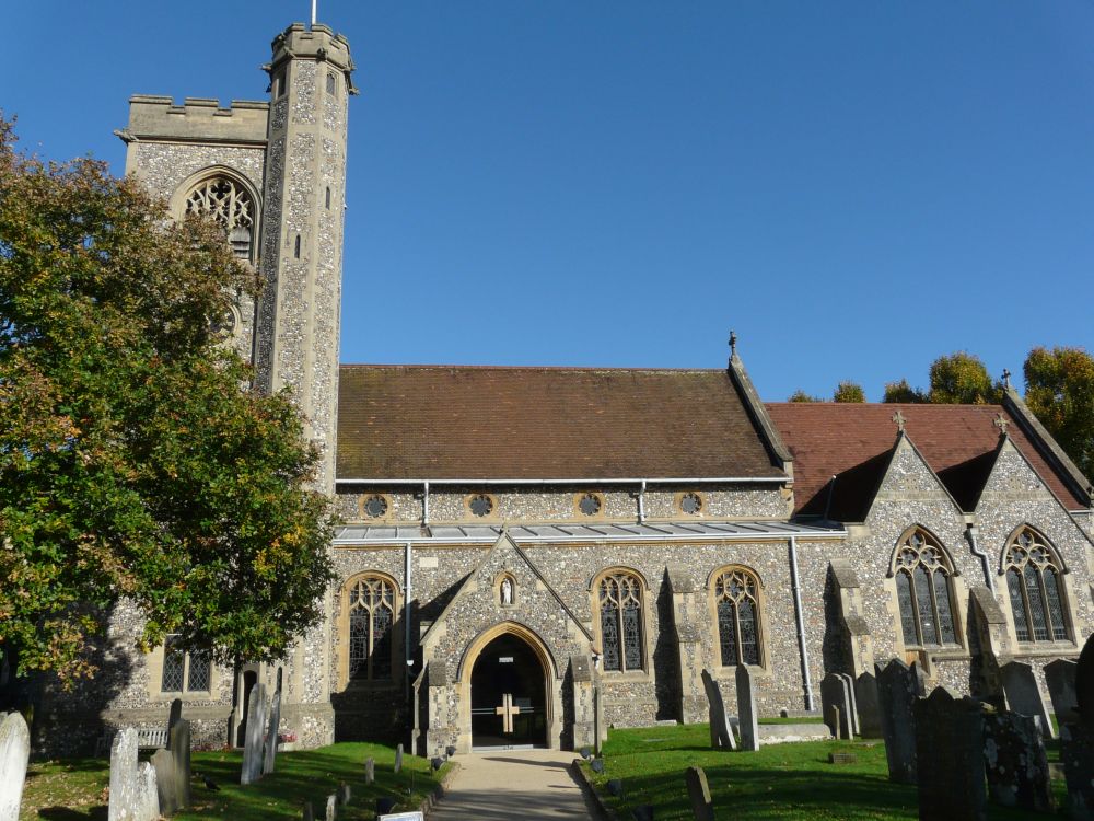 In the centre of the small town 3 miles north of Welwyn Garden City. Most of the church dates from an almost complete rebuilding of 1911 by C.J. Blomfield. It was much rebuilt, including a new east window, after a fire in 1952.