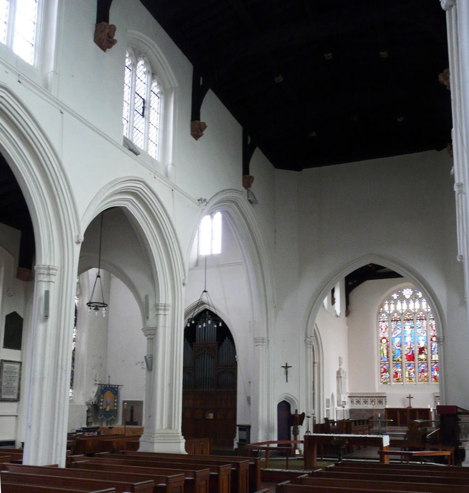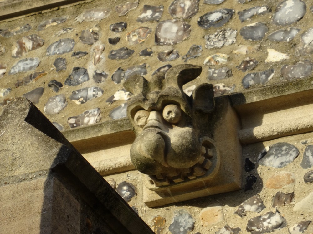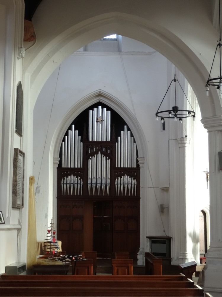 Sideways on to the main street at the west end of this east Hertfordshire town. Large and mainly 14th and 15th century but much restored by George Godwin in 1852. The organ has received a major refurbishment in 2016 and the old brass coloured pipes are shown alongside the new silver coloured ones replacing them. There are a huge selection of corbels and carved headstops of which only a few are shown here.