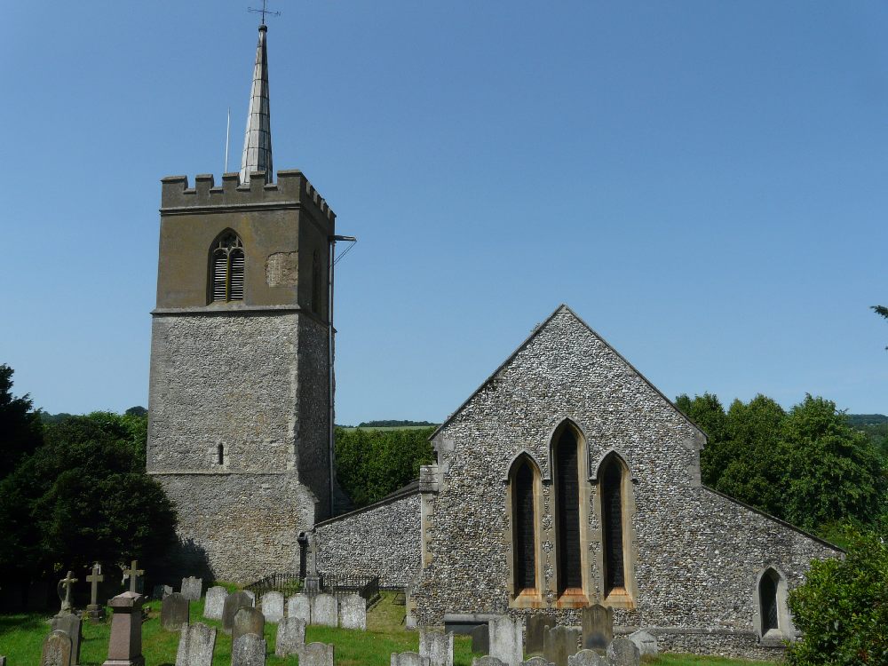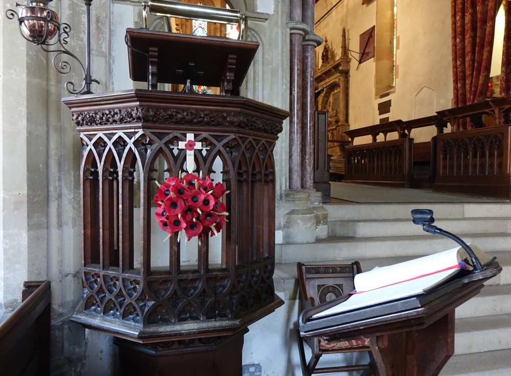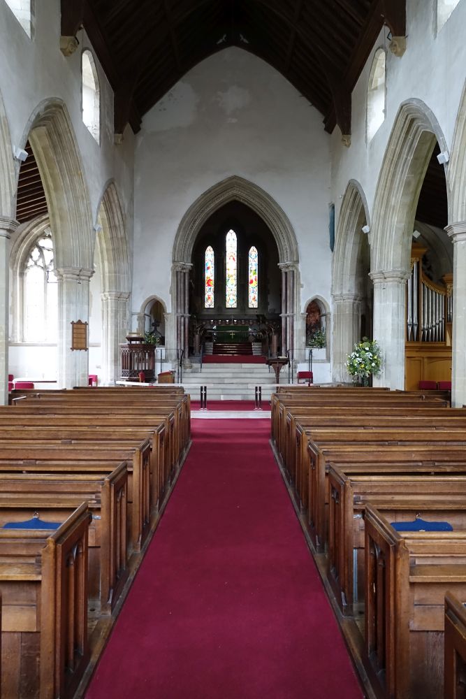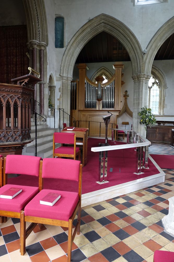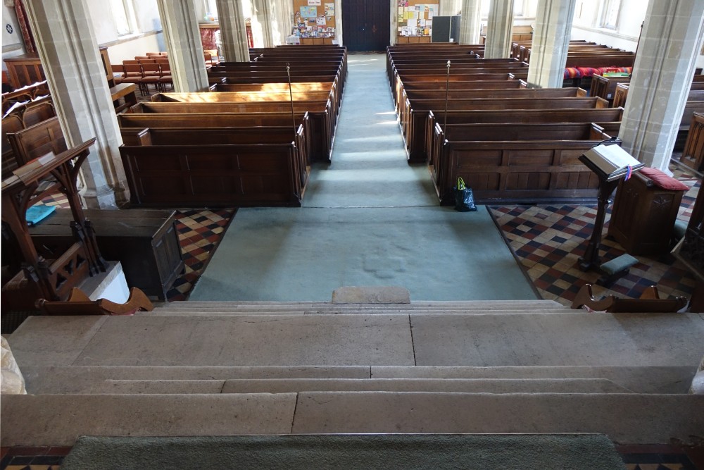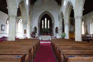 In the centre of an attractive village. There is an almost detached 15th century tower and the church steps steeply up a hillside. The upper parts of the churchyard are level with the aisle roofs. The chancel is 13th century. The nave is 14th century with the west porch of the 15th century. It was restored in 1864-65 by G & H Godwin. There was a reordering completed in August 2017 that installed a nave altar dais, kitchen and toilet and this work is easily distinguished below from the red carpet.