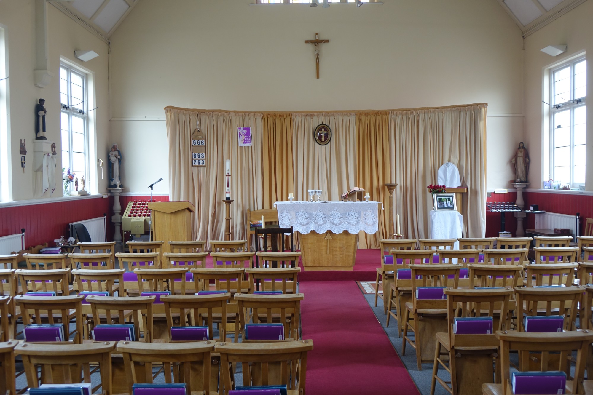 Down a dead end un-surfaced road, it is dated 1896 but looks more like a hall than a church, which is exactly what it was as it was built as a hall for the Anglican parish church and only acquired by the Roman Catholic church in 1998.