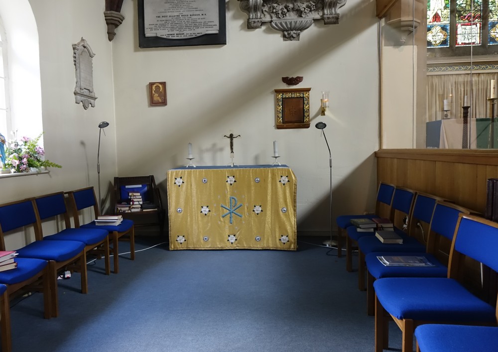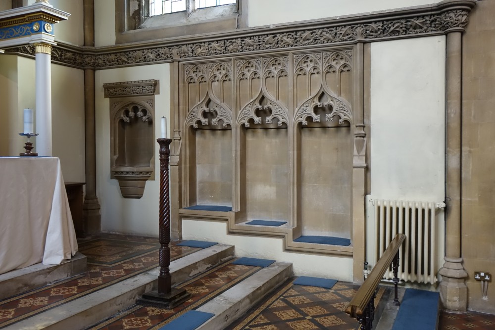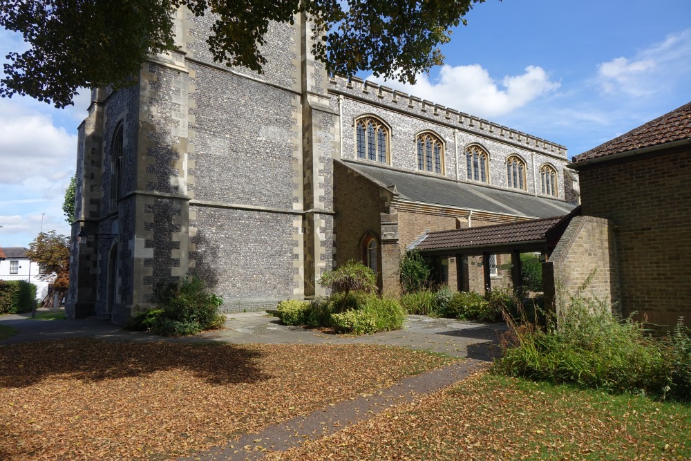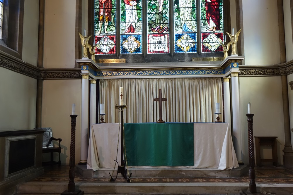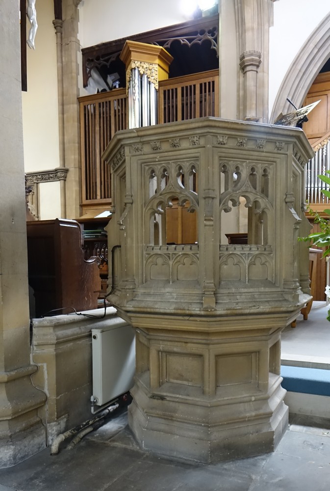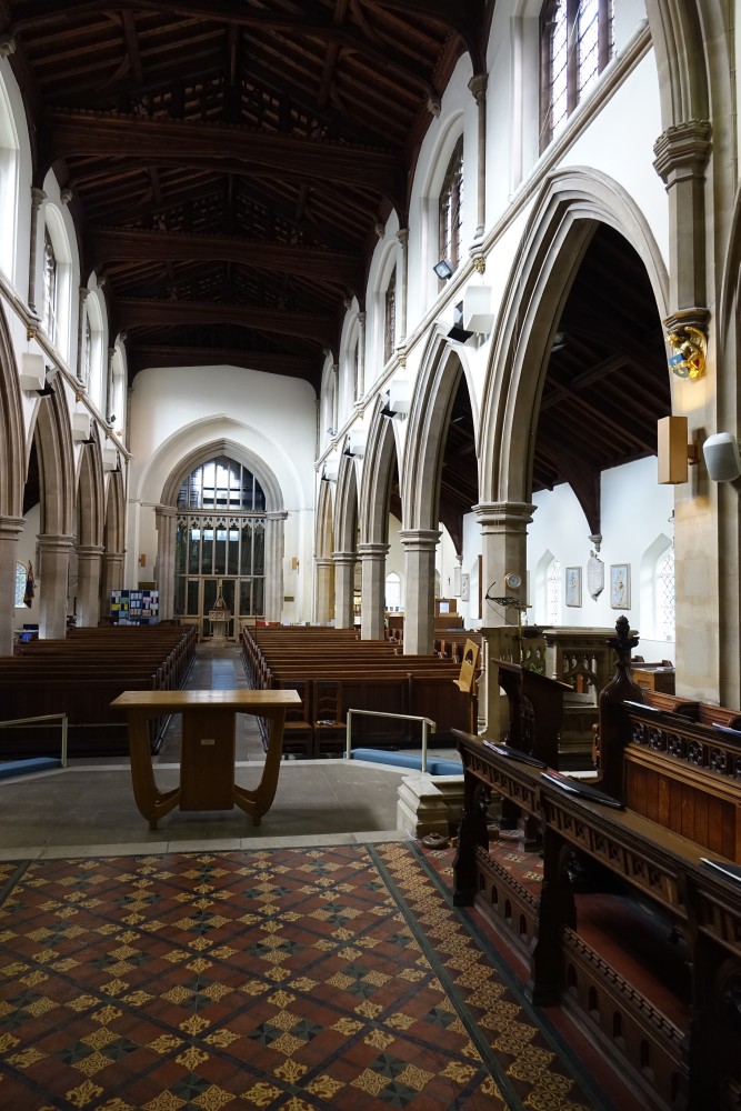 The tower dates from 1630, but the church itself consists of aisles of 1825 by W. Atkinson between which Arthur Blomfield added a new nave and chancel in 1890-91. The east window is a large Burne-Jones crucifixion by Morris and Co. It is shared with the Methodists under a Local Ecumenical Partnership.