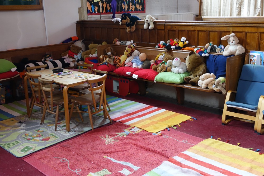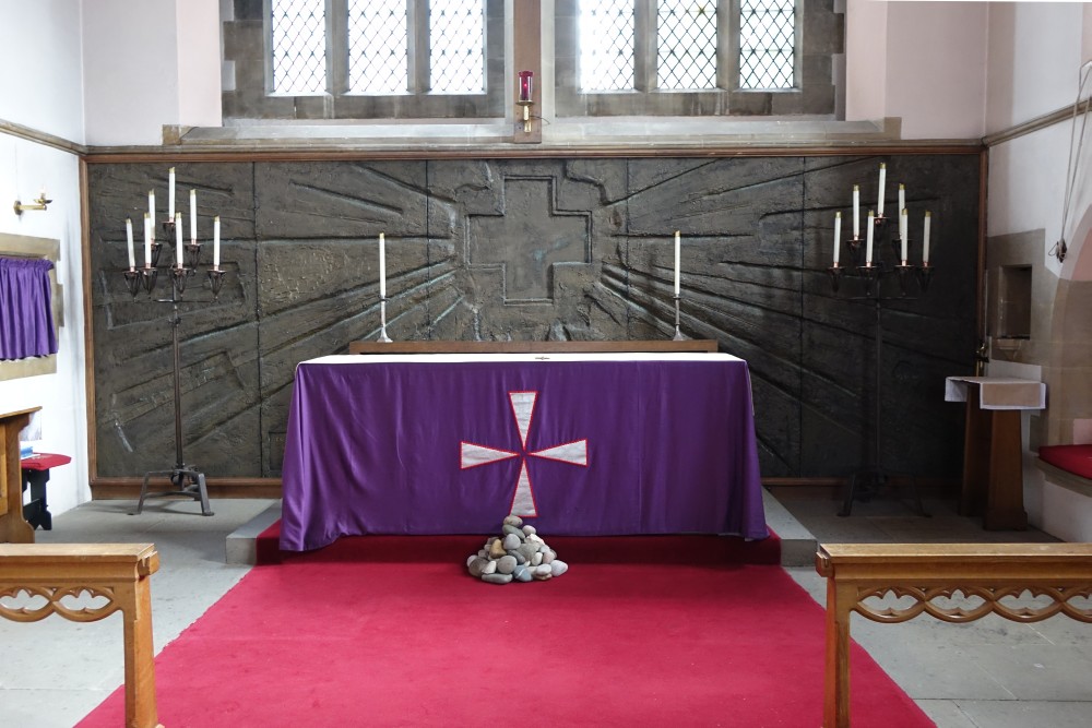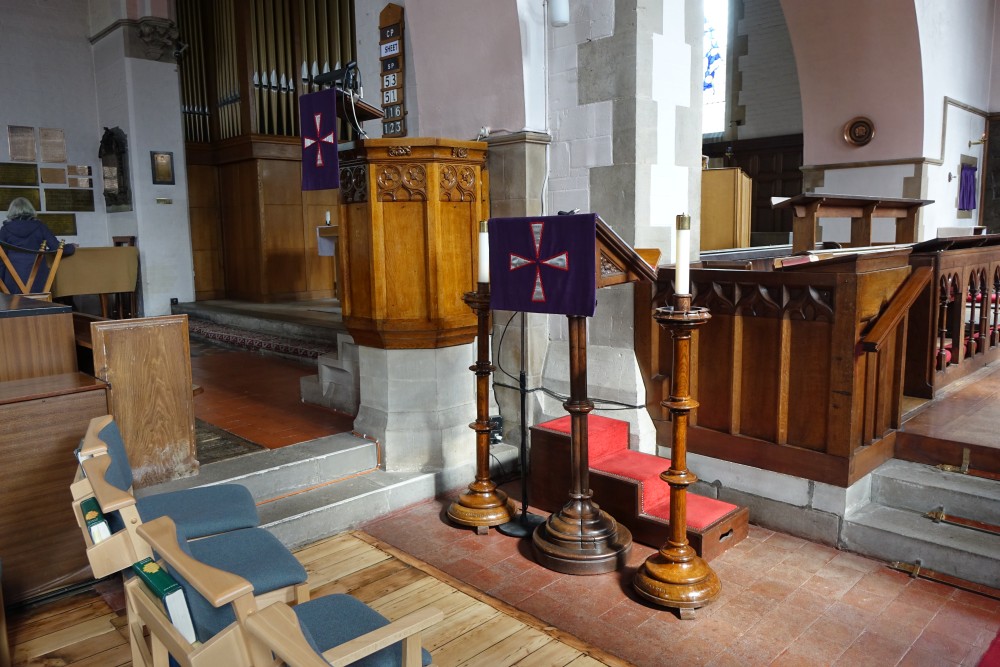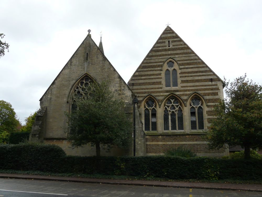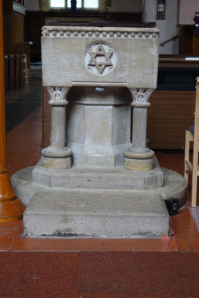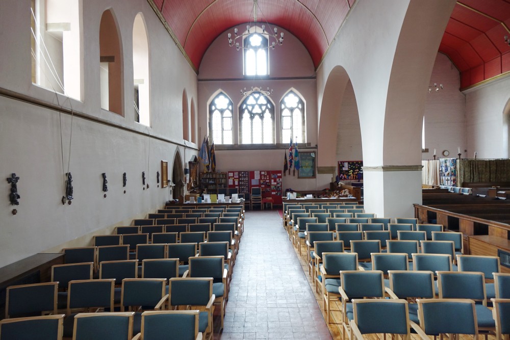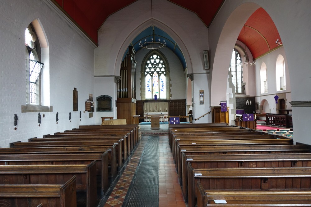 A double naved church on the edge of the green. The original nave dates from 1870-72 by John Norton, it was enlarged, at a slightly lower level, in 1906 to designs by Temple Moore. Between my first visit in October 2013 and my next in March 2015, the nave pews were replaced by seats.