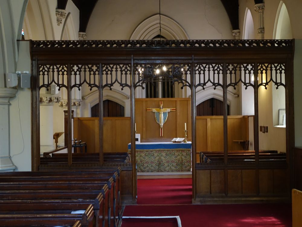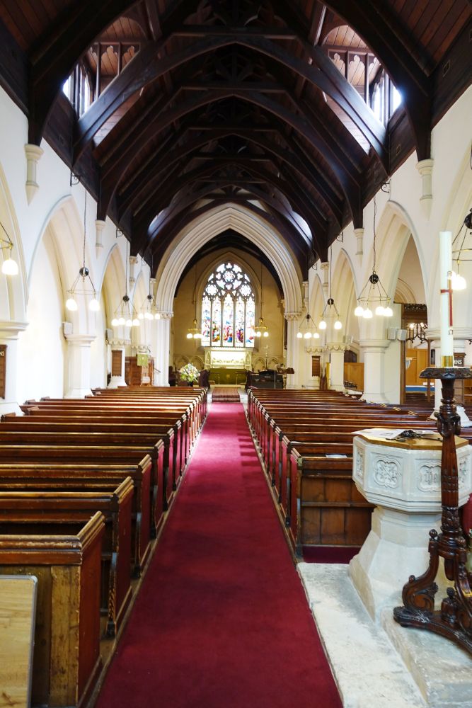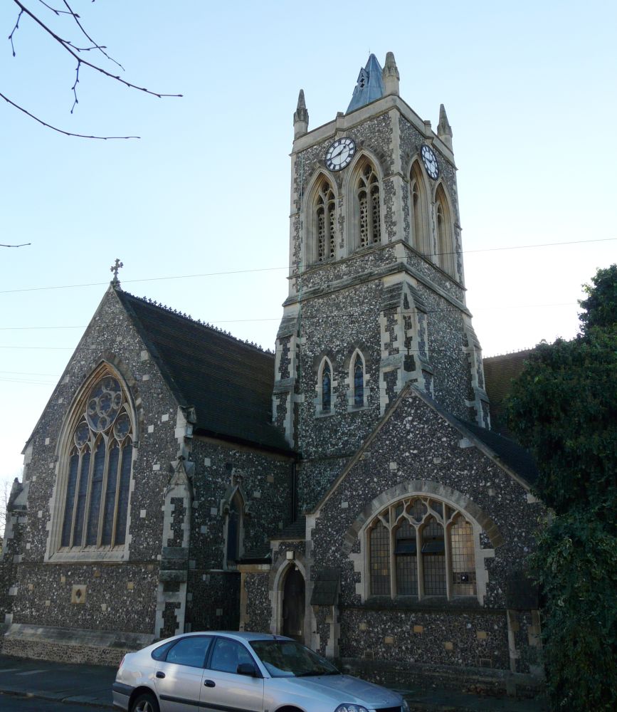 Not far from Christ Church but on the town centre side of the railway line. The church was designed by S.S. Teulon and built 1853-57. W.W. Baldwin added the south aisle in 1865. The north aisle is divided off to form a hall and ancillary rooms.