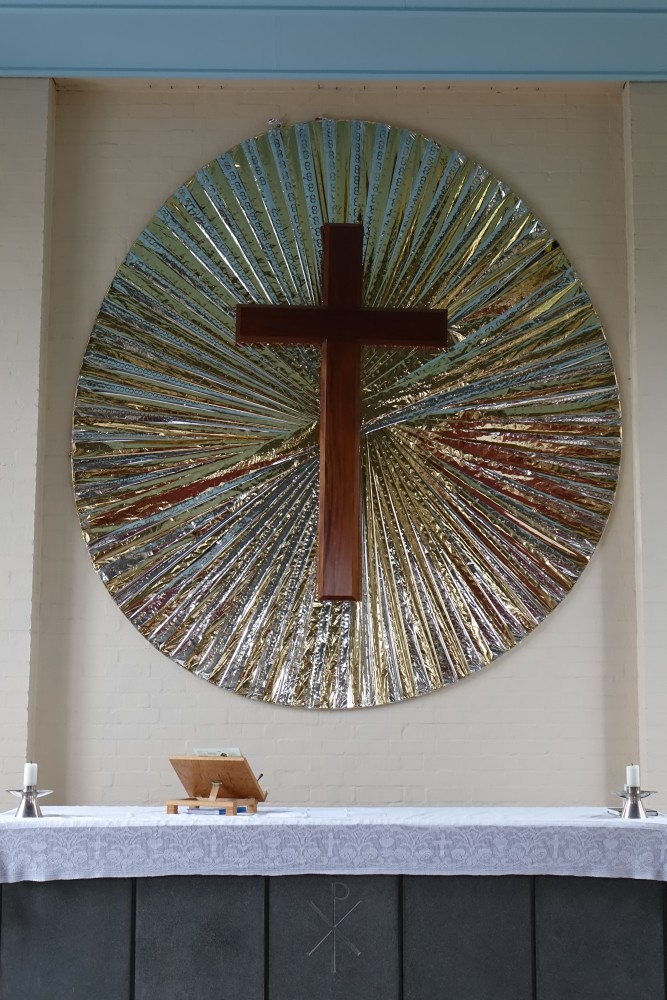 On a crossroads in one of the original neighbourhoods on the west side of the town. Built in the 1950s by the Chief Architect of the Development Corporation H. Kellett Ablett.
