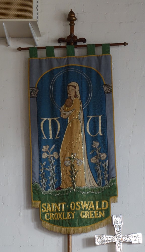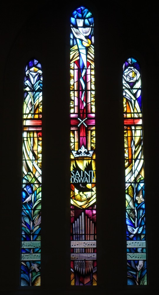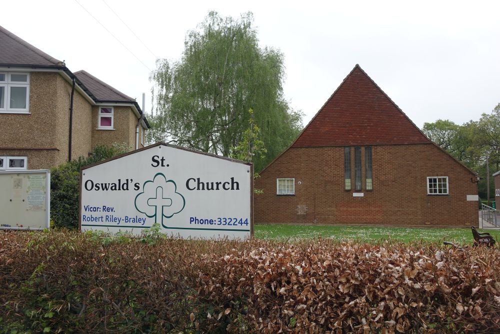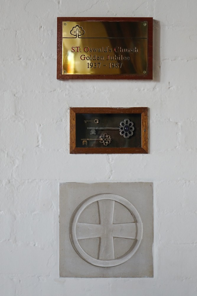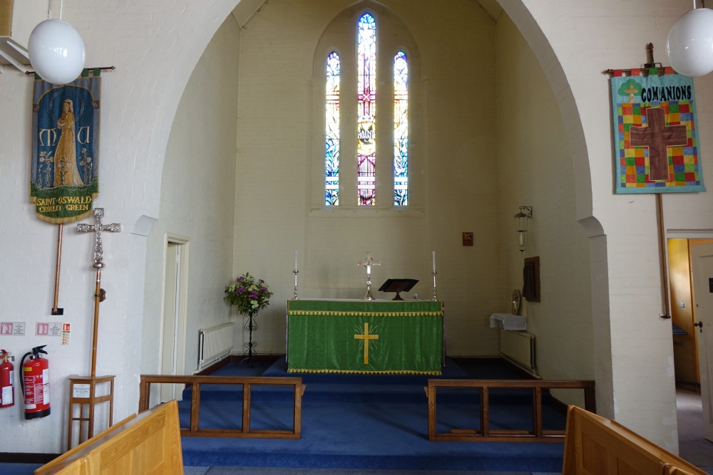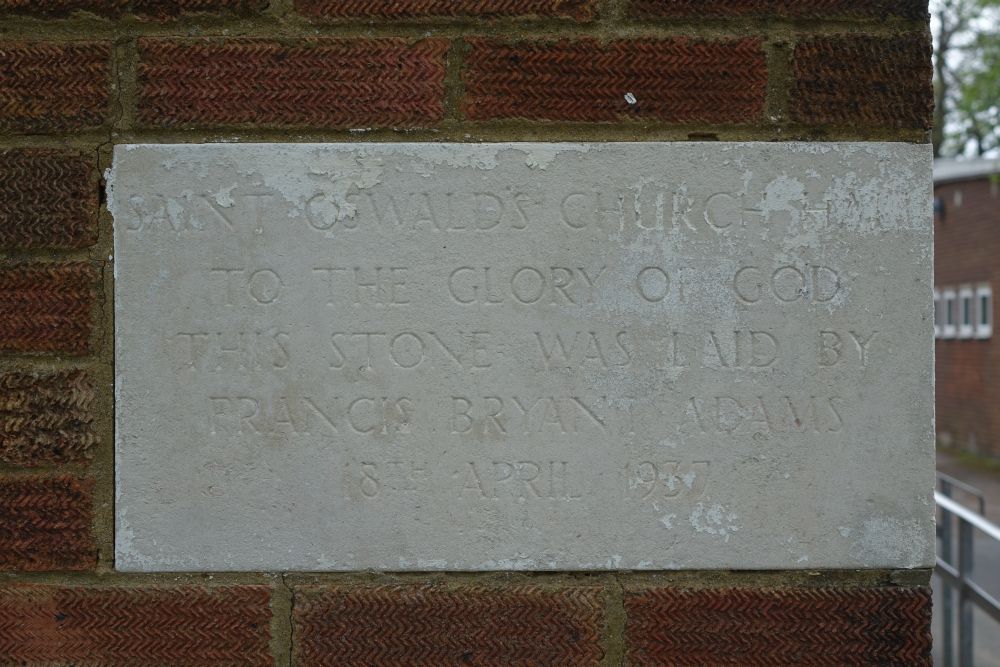 In suburban streets near St Bede’s Roman Catholic church. St Oswald dates from 1937, it was built as a hall/church to designs by Leslie Moore a separate hall next door was built in 1961. This meant that the original building could be consecrated as a church in 1962.