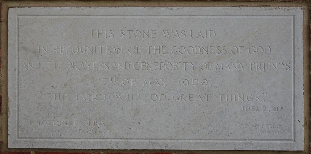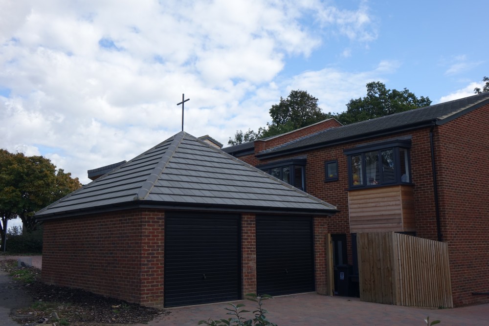 The previous church (1960-61) has been demolished and is being replaced (March 2015) by a new church, hall and small housing development designed by Molyneux Architects. This is now finished and the lower pictures show this completed building.