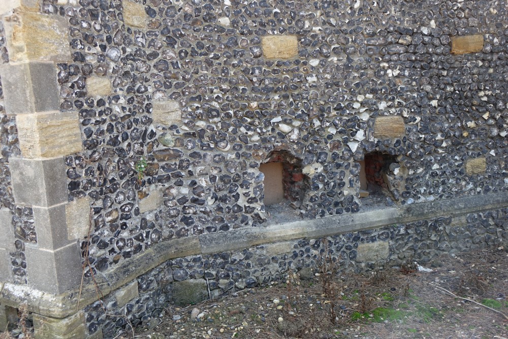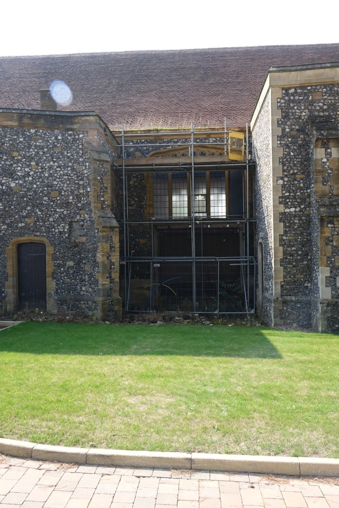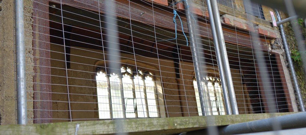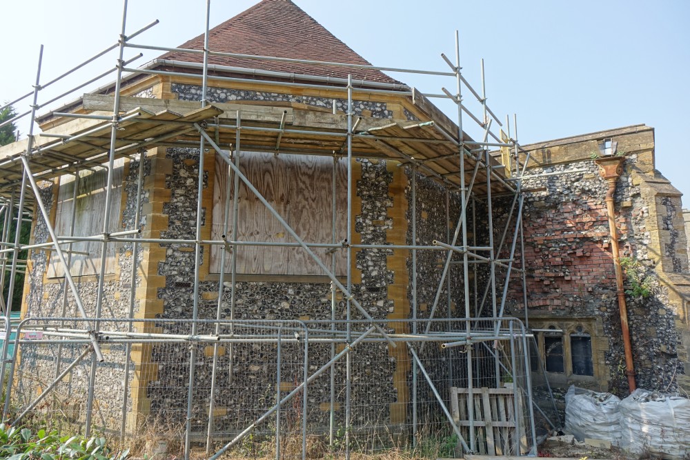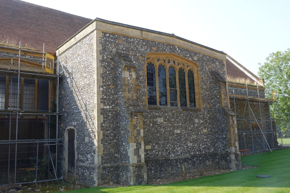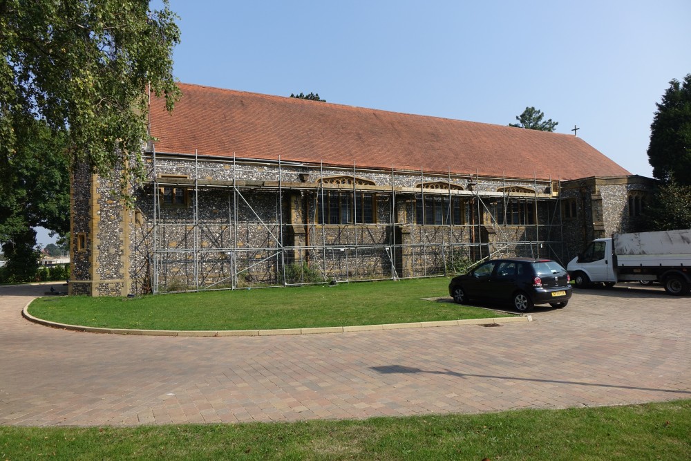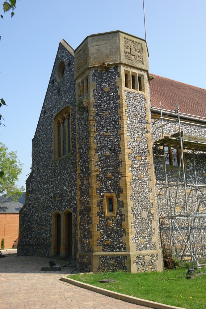 Part of a vast collection of buildings on the edge of Bushey. The chapel is flint faced, while the rest of the site is red brick. The school dates from 1902 and was designed by Gordon, Lowther and Gunton. It closed in 1977 and was briefly the United States International University (Europe). The site is now being redeveloped as Royal Connaught Park which much new building. However the chapel is surrounded by scaffolding and totally stripped of furnishings, decoration and floor. See the link below for the interior in a state of dereliction but complete as recently as 2013. It was designed by E.Doran Webb and built in 1900. The interior is visible though an rsj supported opening where the organ appears to have been removed. The foundation stone is at the east end but is difficult to see through green netting and scaffolding.