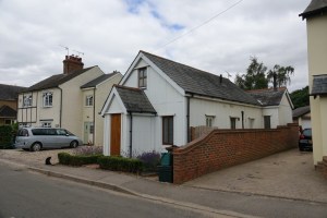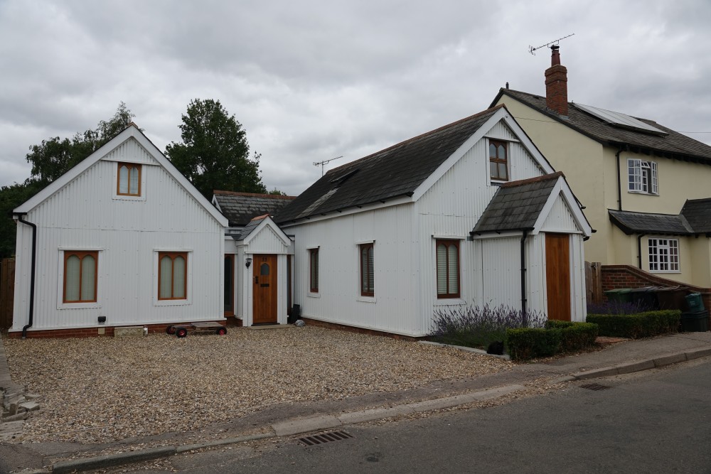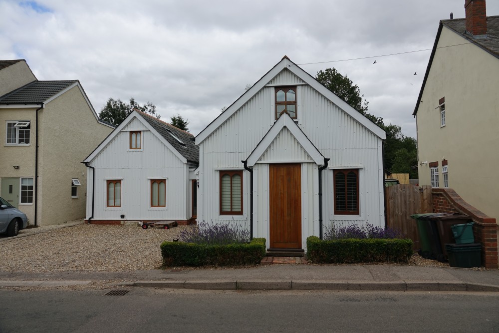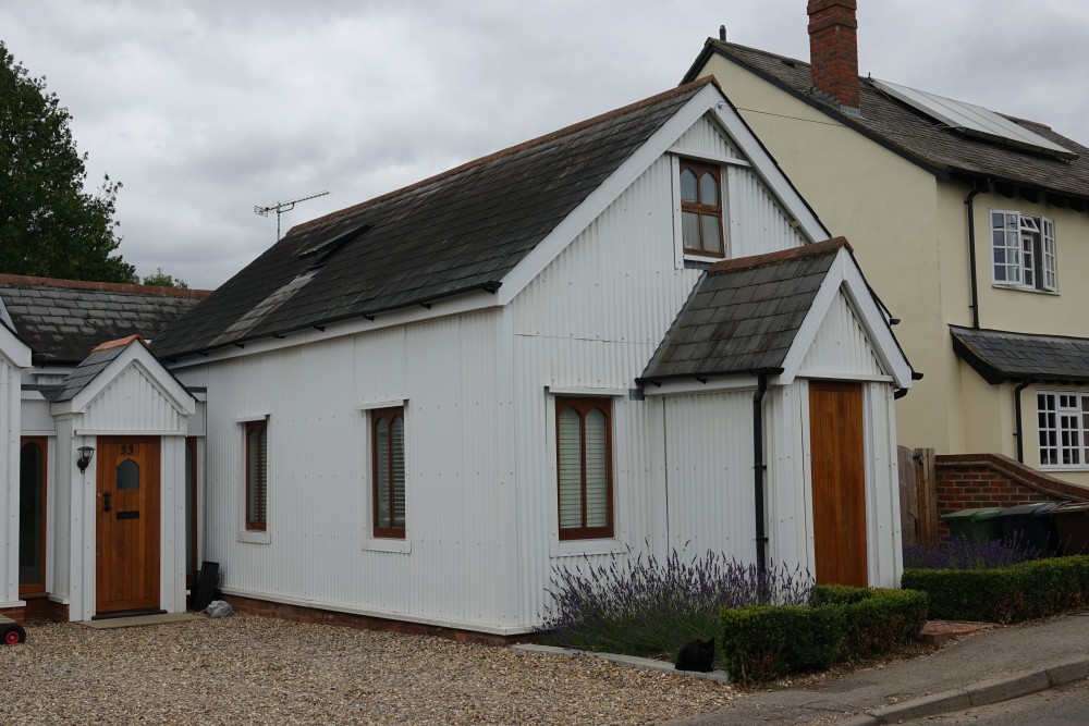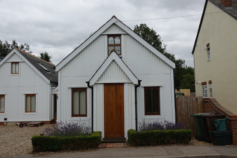 Just outside St Albans in this small hamlet and still marked on Ordnance Survey maps with a cross, this tin tabernacle has been extended in matching style and is now a house. I cannot find anything about its history.