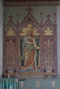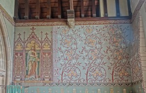 In a large churchyard in a hilltop village isolated by the M25 from much of the rest of Hertfordshire. The church is 15th century with a porch of 1881 by A. Billing. There is a large 15th century St Christopher wall painting on the north wall. At the time of visiting (October 2014) the east window was away for restoration and replaced by polycarbonate sheeting.