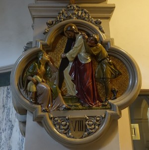 A couple of doors up the road from the Anglican parish church. It was designed by E. Doran Webb and built in 1904-07. An interesting interior, with arts and crafts glass by Paul Woodroffe from 1906 in a side chapel, which incorporates some medieval fragments.