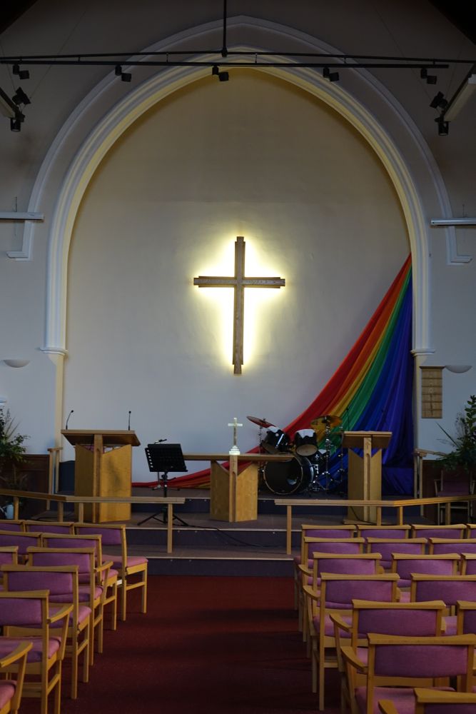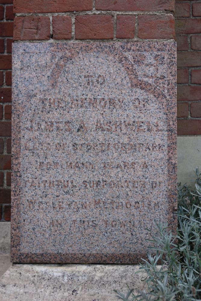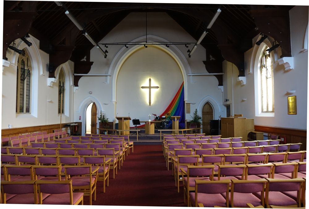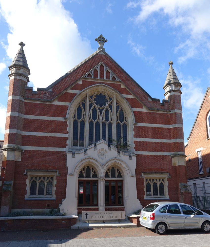 Right in the middle of the town centre. The church dates from 1902. Large extensions for halls etc on the south side abut right up to the church building.