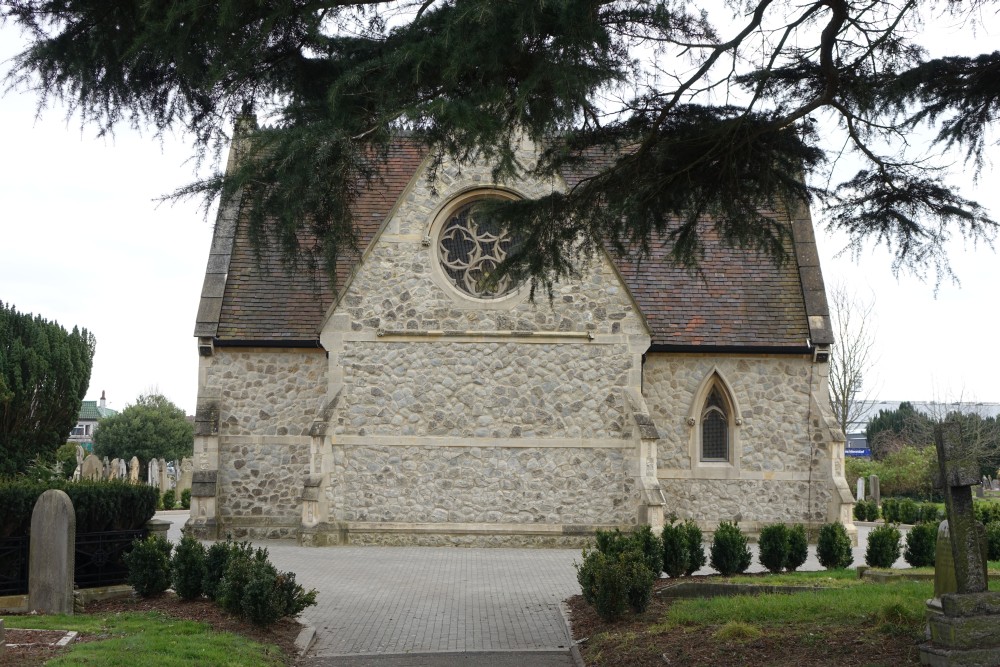 A small cemetery north of Hoddesdon town centre. The chapel is still in use and not locked – a great rarity.