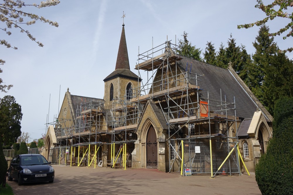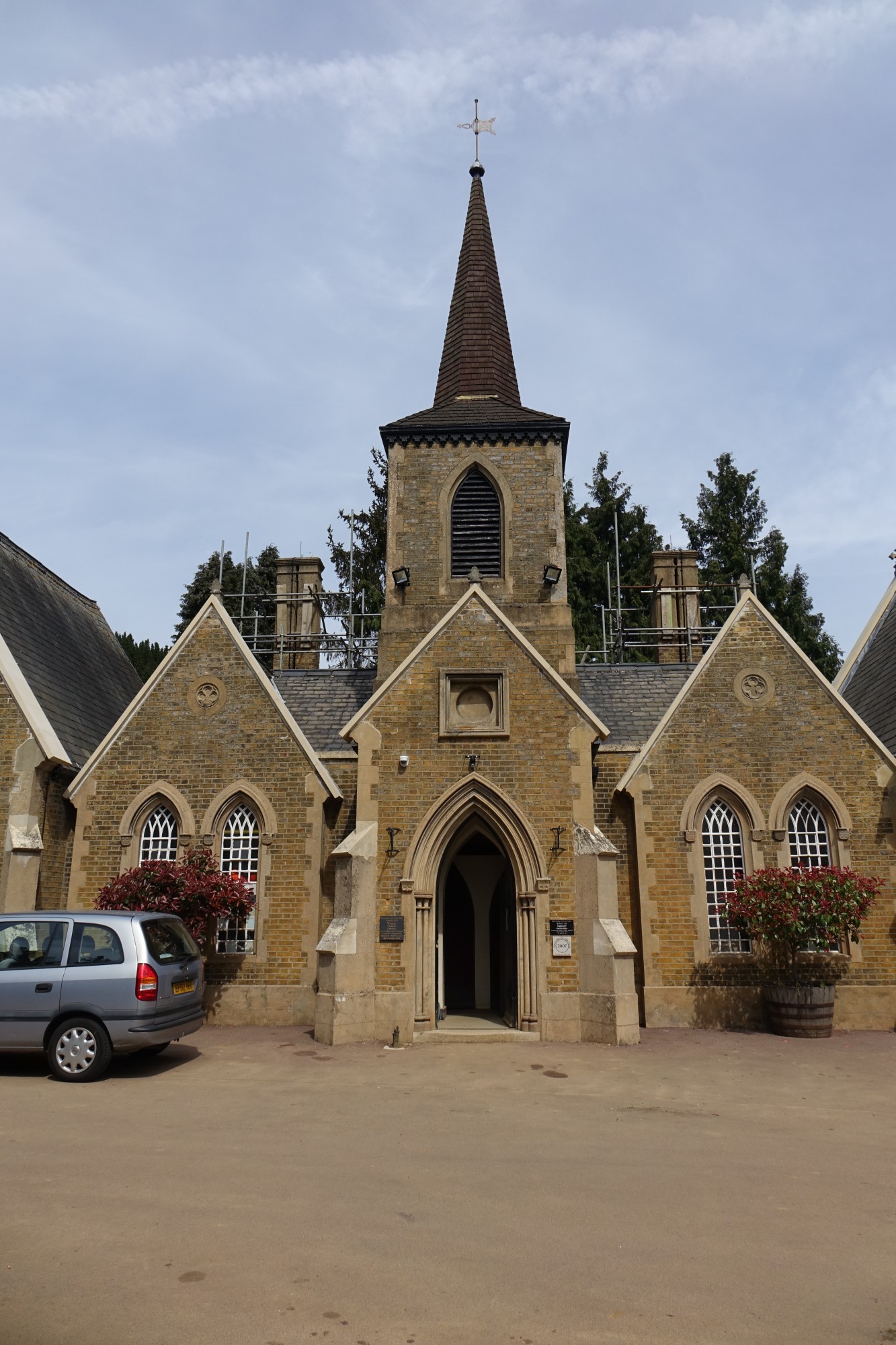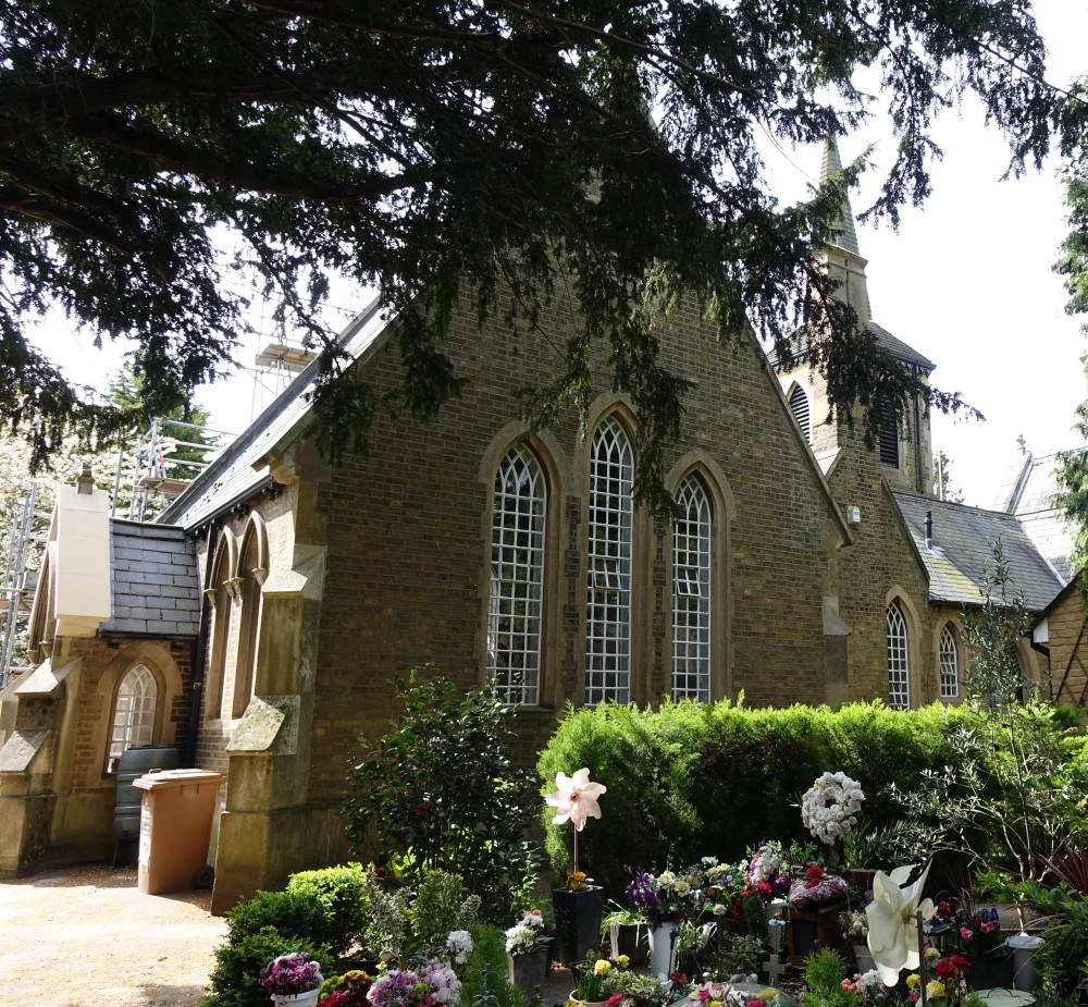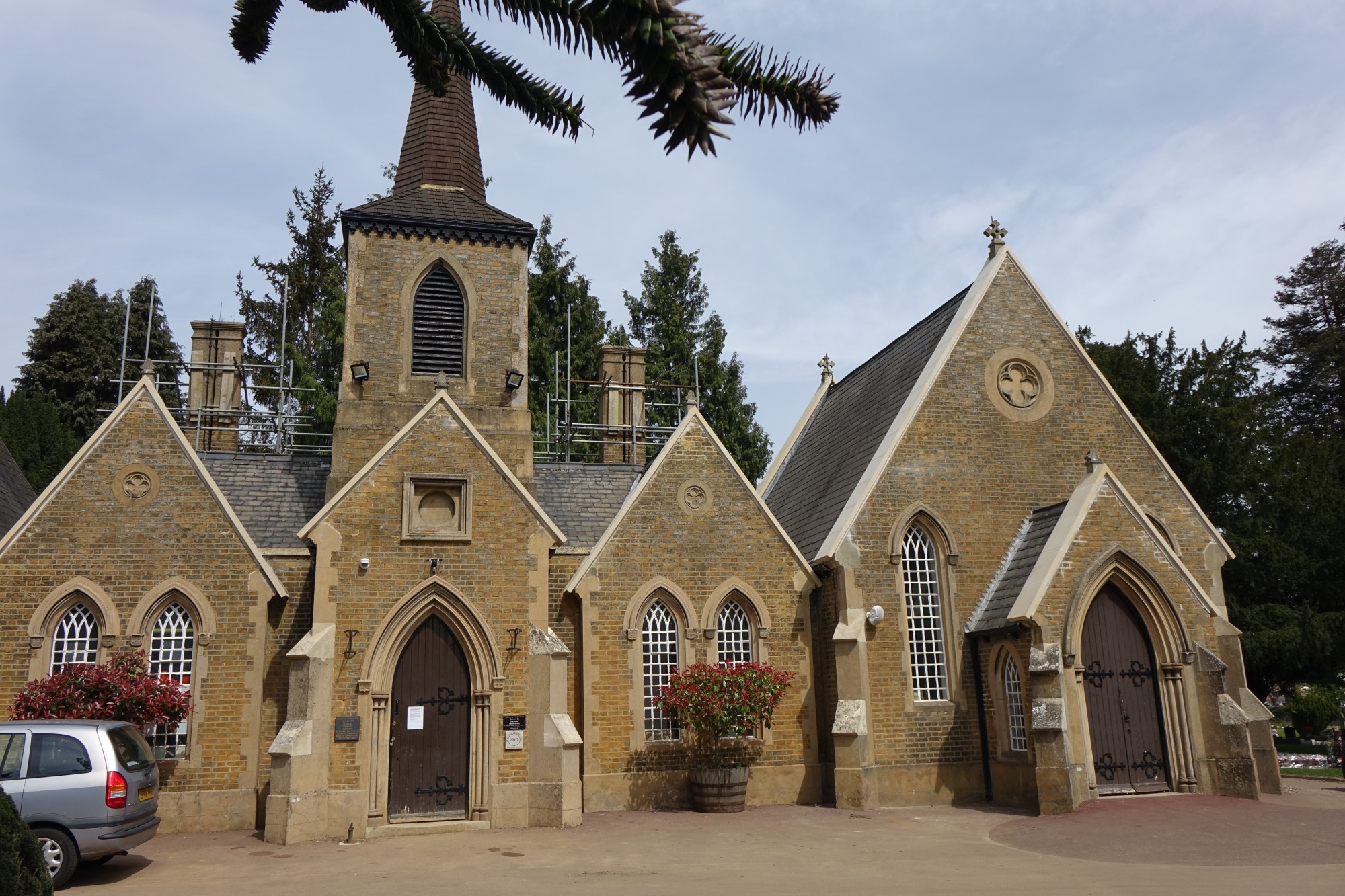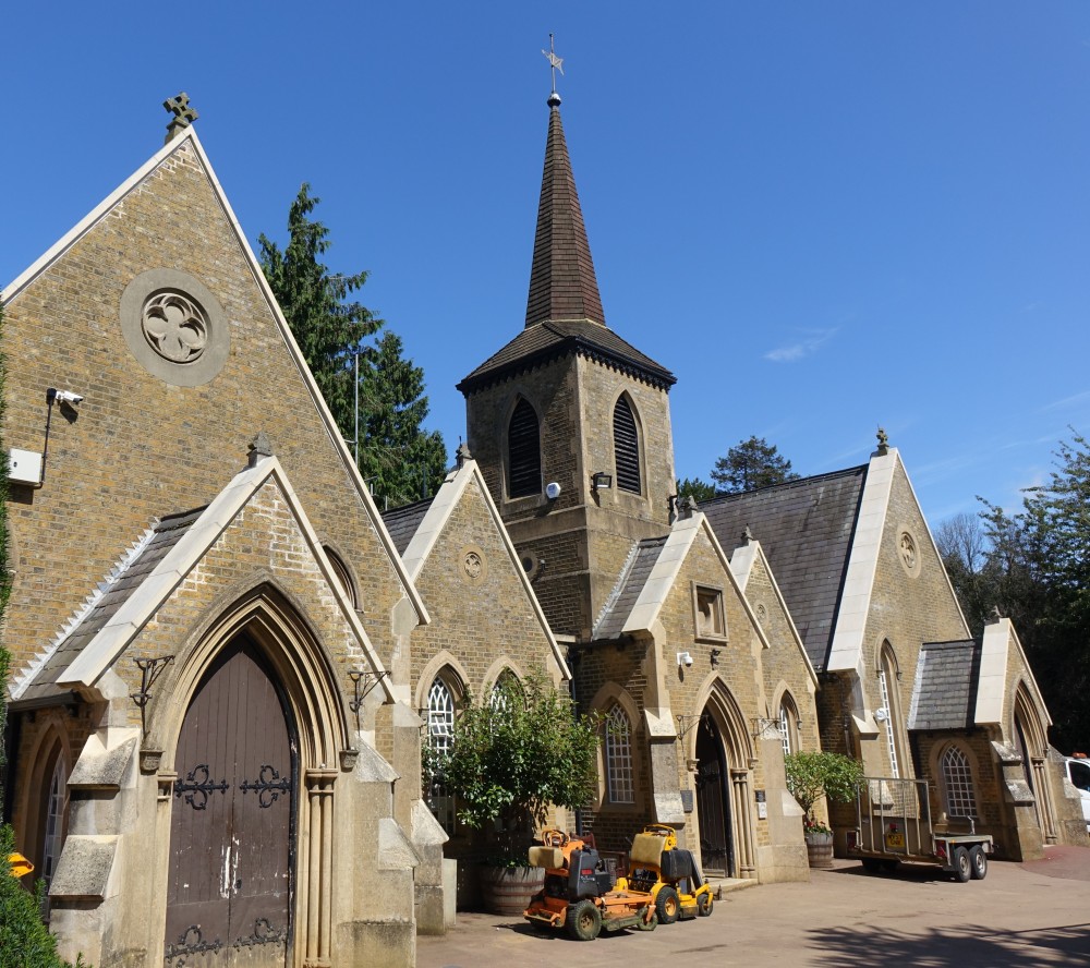 A pair of chapels with a common tower (1855) in this cemetery in the Bury Green area of western Cheshunt. Still in use and restored in 2015-2016 (see pictures with scaffolding).
