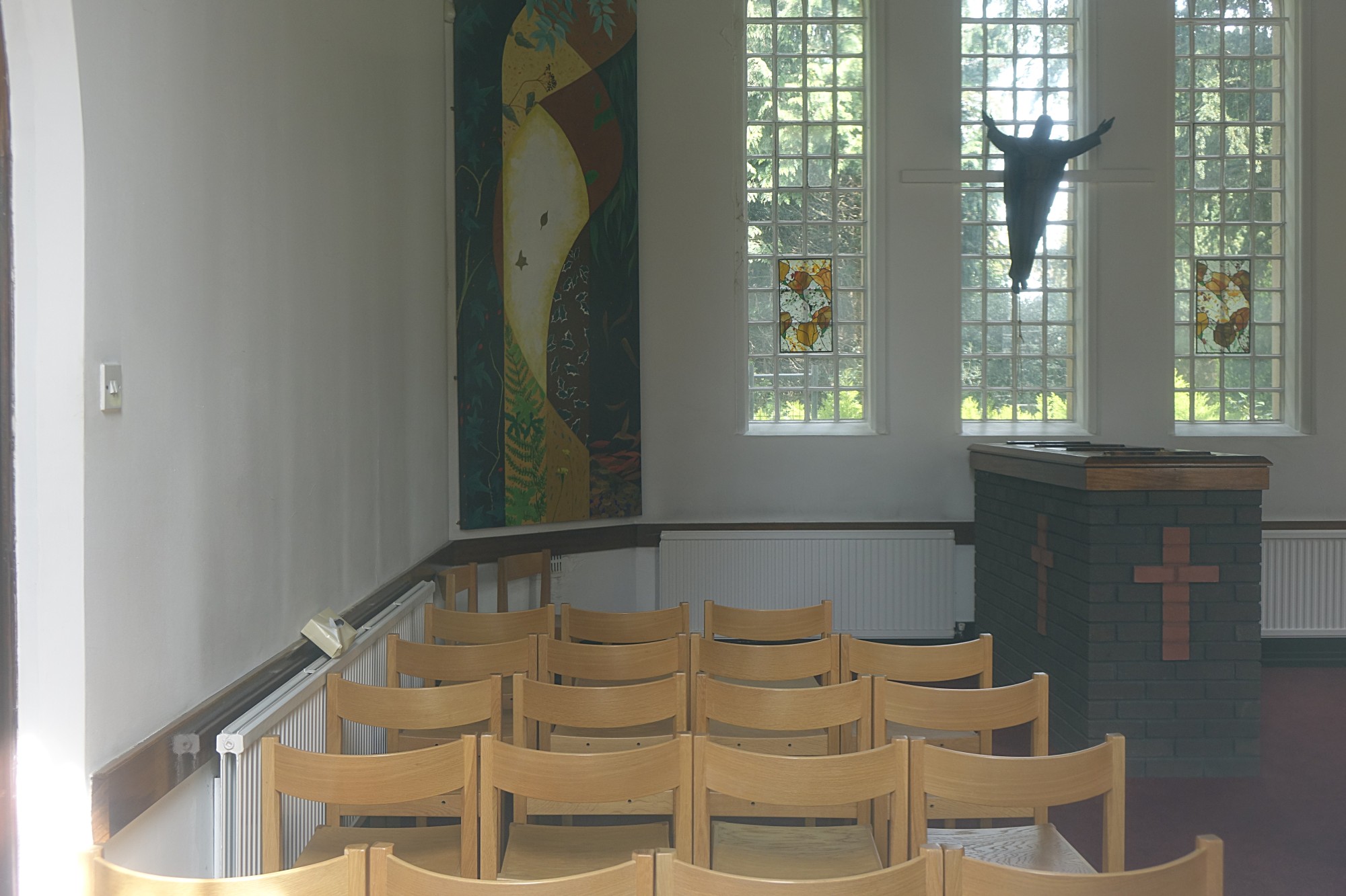On the western edge of the town, the chapel is a simple post war building.