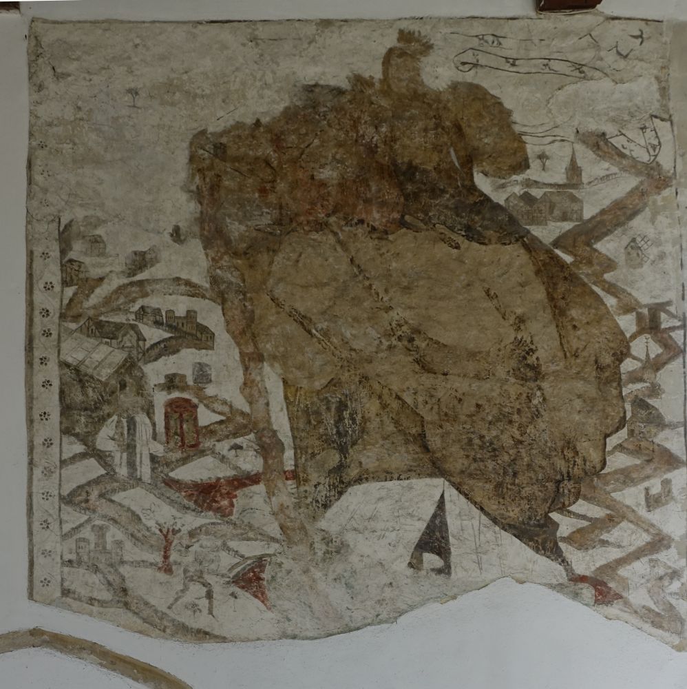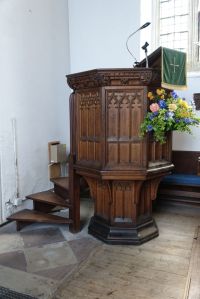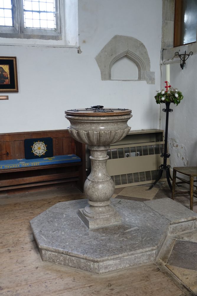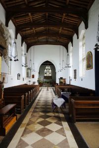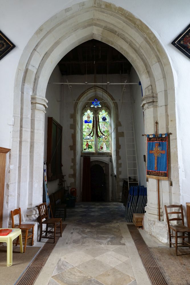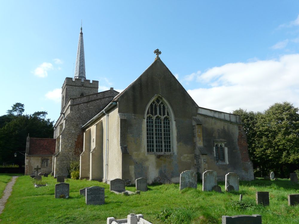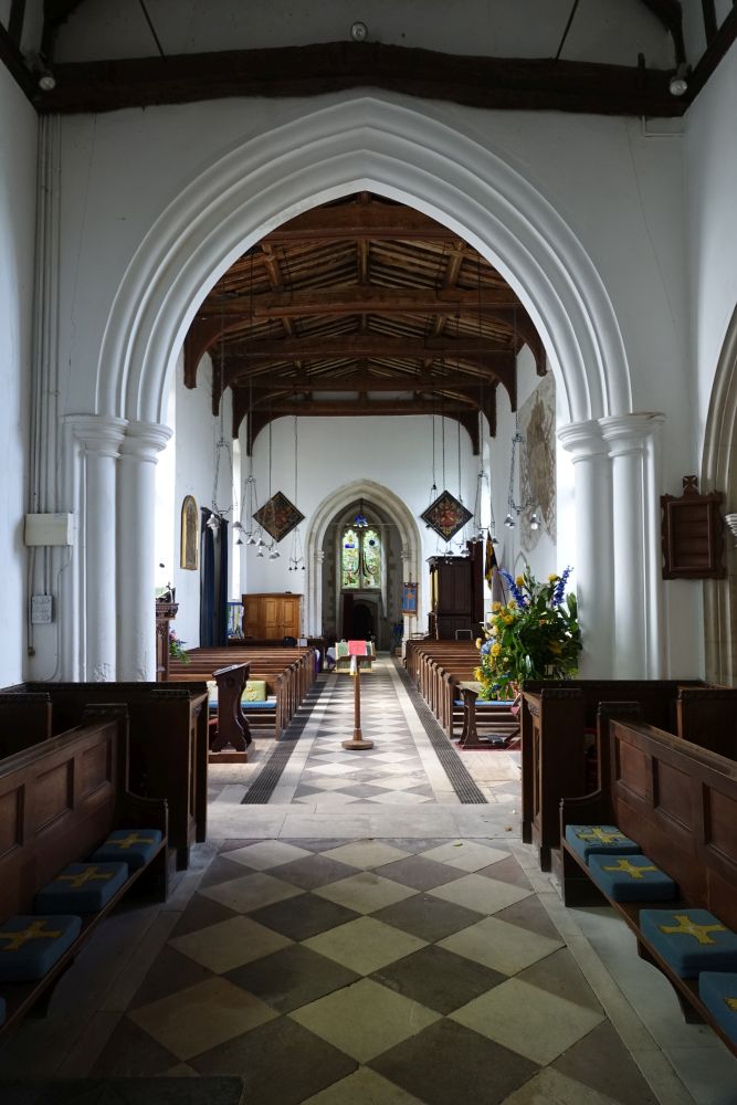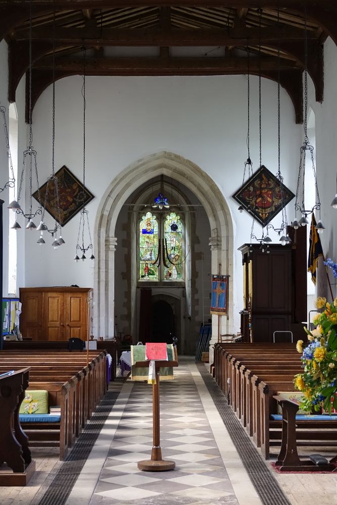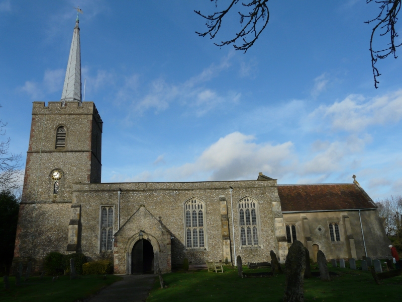 A long village along the A507 west of Buntingford, the church sits in a triangular churchyard towards the western end of the village. Medieval with a very tall nave, but no aisles and an interior with a prominent St Christopher wall painting.