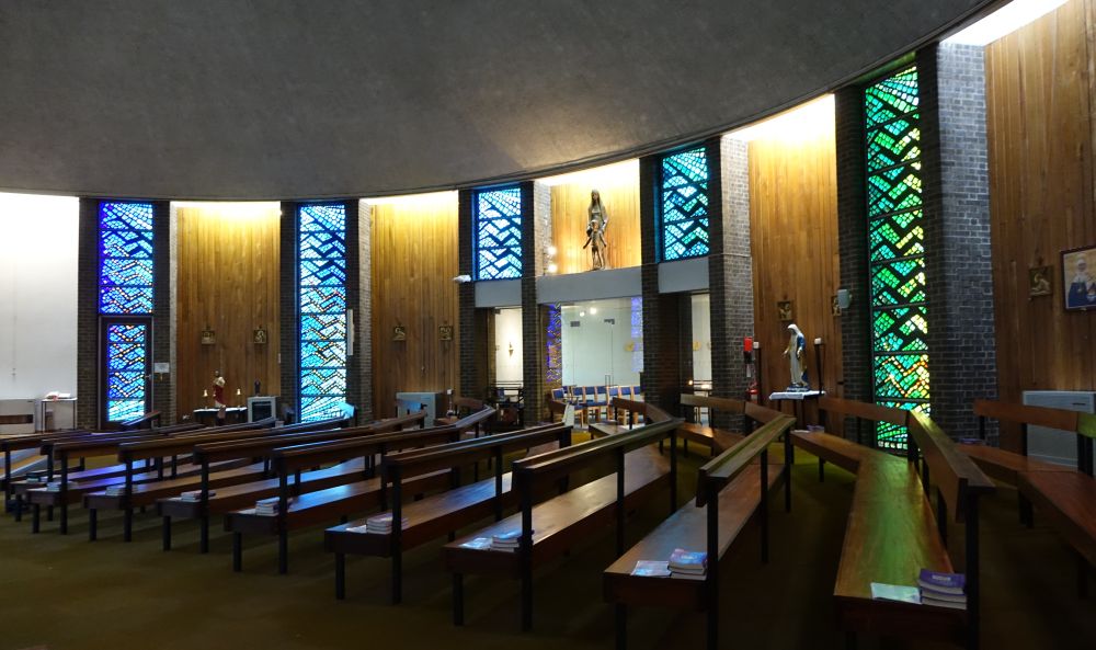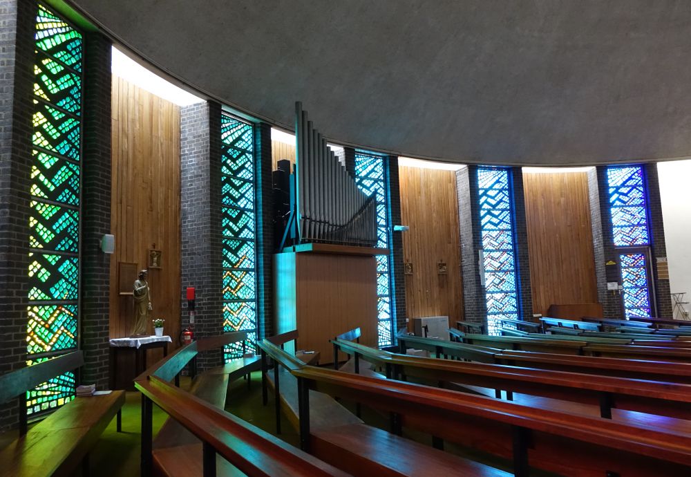 At the base of the hill below Hatfield House in Old Hatfield, this circular church dates from 1969-70 and is by George Mathers of Mathers, Thomas and Associates. The previous church (St Theresa) of 1929 is now its hall. The interior glows with dalle de verre glass made by Charles Norris of Buckfast Abbey.