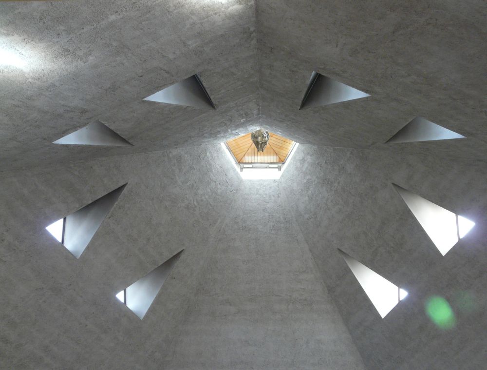 At the base of the hill below Hatfield House in Old Hatfield, this circular church dates from 1969-70 and is by George Mathers of Mathers, Thomas and Associates. The previous church (St Theresa) of 1929 is now its hall. The interior glows with dalle de verre glass made by Charles Norris of Buckfast Abbey.