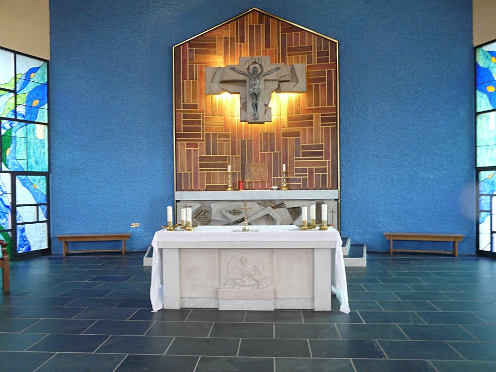 Designed by George A.J. Mathers 1962-64. Despite the central spire and lantern it is still a traditionally planned building. It sits on the south-eastern edge of St Albans.