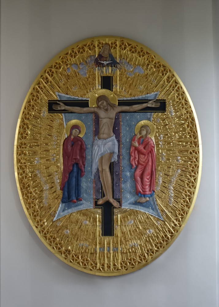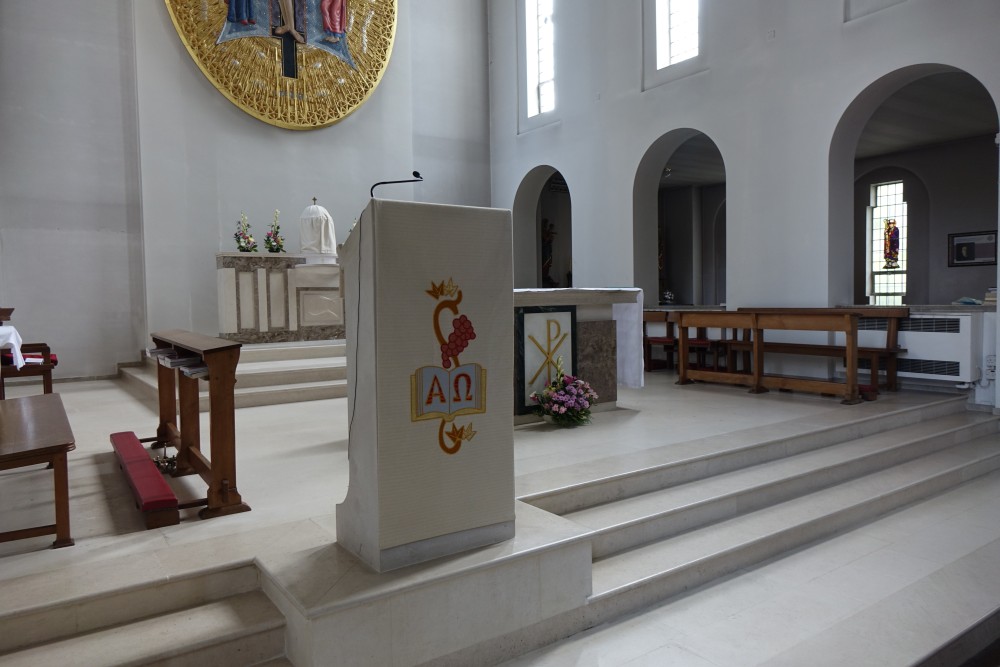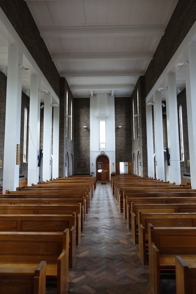 Built in 1957 to designs by Sterrett & Blouet, with a rebuilding and reversal of orientation following roof problems in the 1980s. This was to designs by Williams & Winkley. Only the tower remains from the original building. Part of the church was divided off to form halls. A further redevelopment took place in 2016-2017 which has reversed the orientation of the church, added a sanctuary, clerestory and new roof. The Lady Chapel that was previously behind the sanctuary is now the entrance narthex area. This work was designed by John Willcock. The right-hand column shows the new church layout, the left the previous one.
