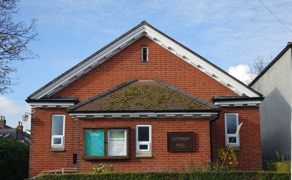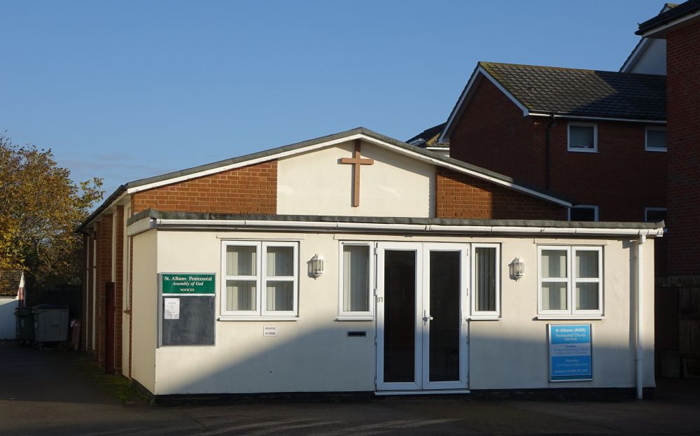 In the eastern suburbs of the town towards Marshallswick. The original building on the site is now the hall and dates from 1949-50, with the current church at right angles being built in 1964 and extended in 1990.