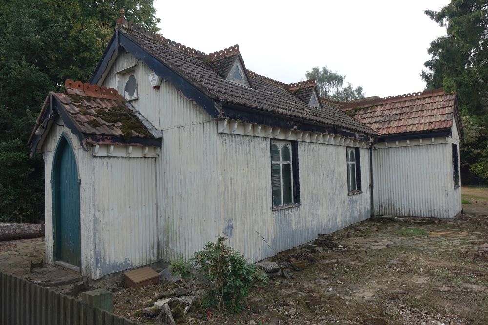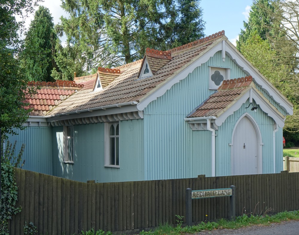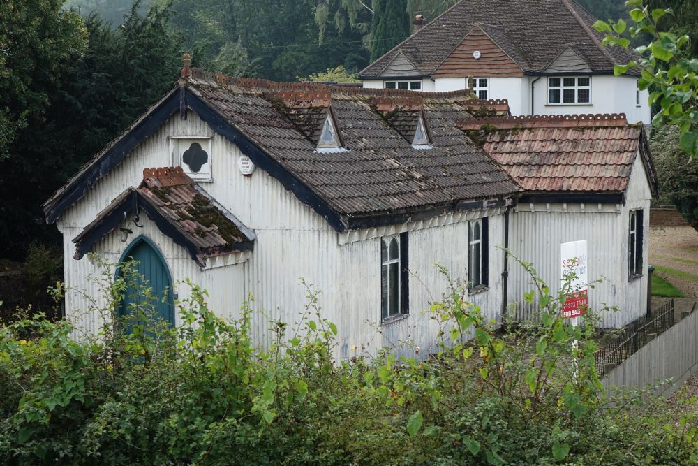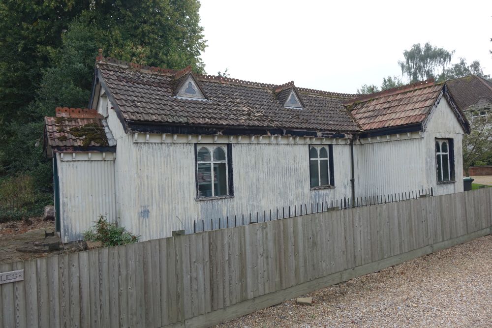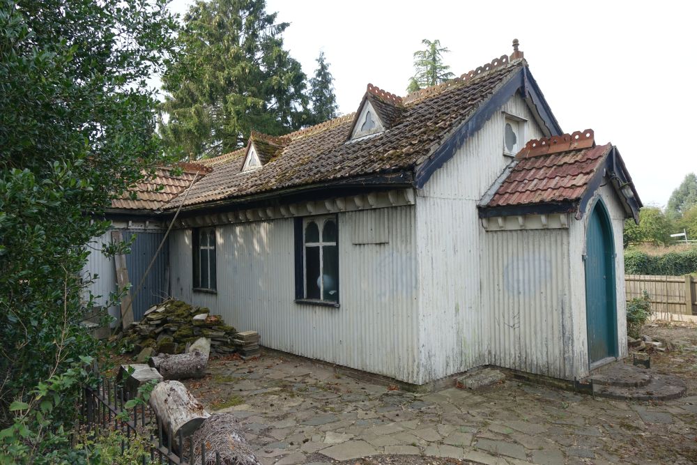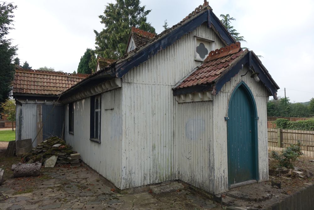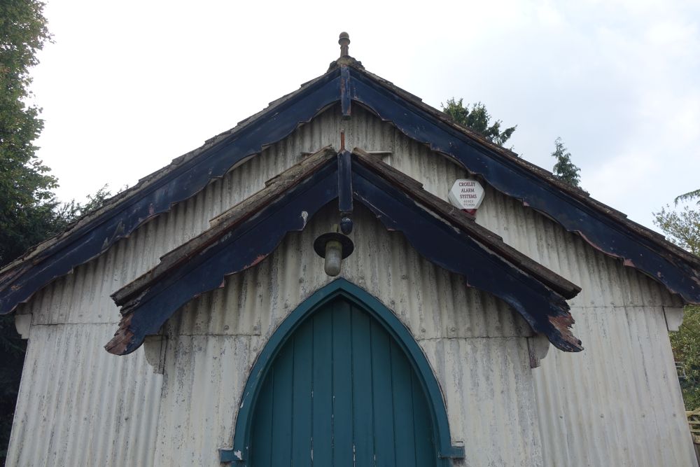 A tin tabernacle erected in 1903 and in use until 1978 as a Mission church. First for All Saints, Croxley Green and then from 1964 Chipperfield parish. It closed in 1978 and was sold into private hands in 1981 and is now a large shed in the front garden of a house. It is locally listed by Three Rivers Council. It could have been yours (with a 5 bed house) for offers in excess of £1 million (September 2014). I Passed by in July 2016 and it has had a facelift.