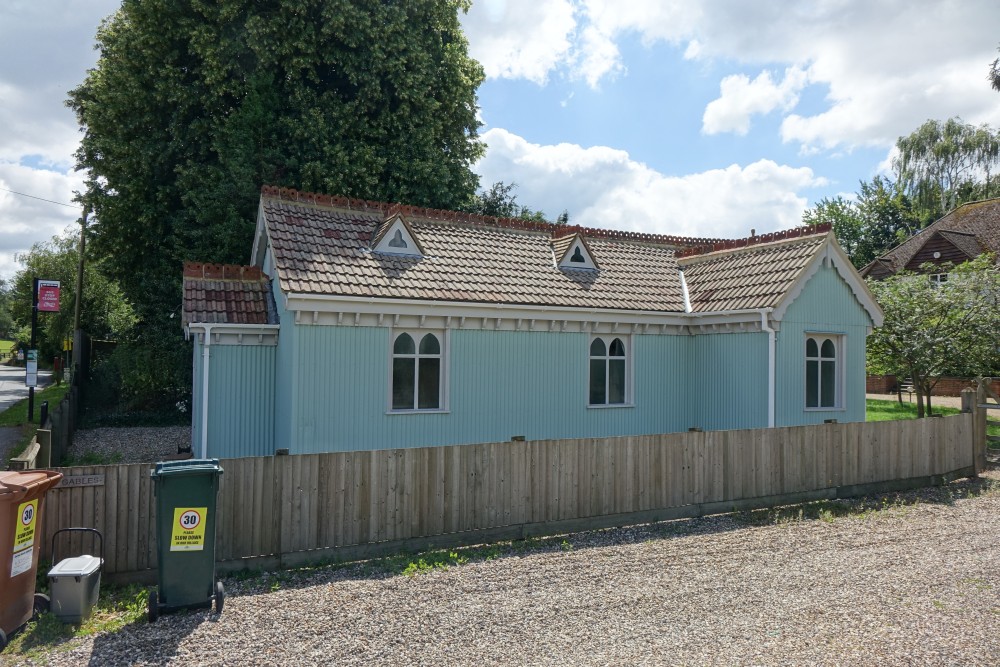 Overlooking the large green in this village just east of Luton. This is an iron church built in 1904. One side has been updated with uPVC windows but the rest retains wooden windows. Views in are not really possible as the windows have marbled glass. It is only used for occasional public services such as at Easter and Christmas and by the CoE village school. There is no signboard outside but the churchyard is well tended, with quite a number of small iron grave markers from the 1920s to 1950s. It forms part of the parish of St Francis, Luton rather than a Hertfordshire parish.