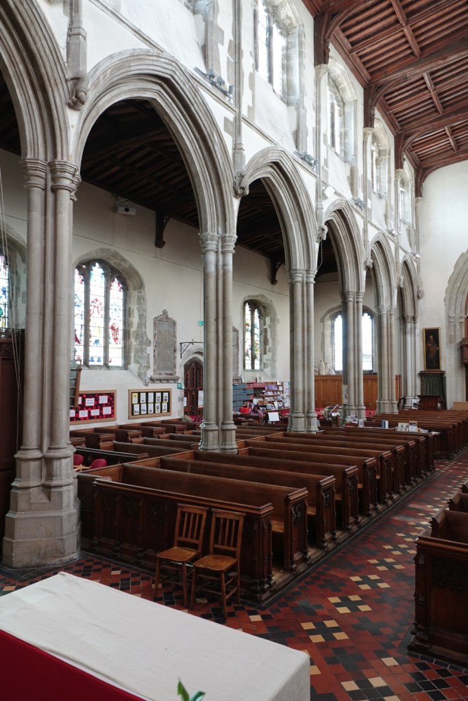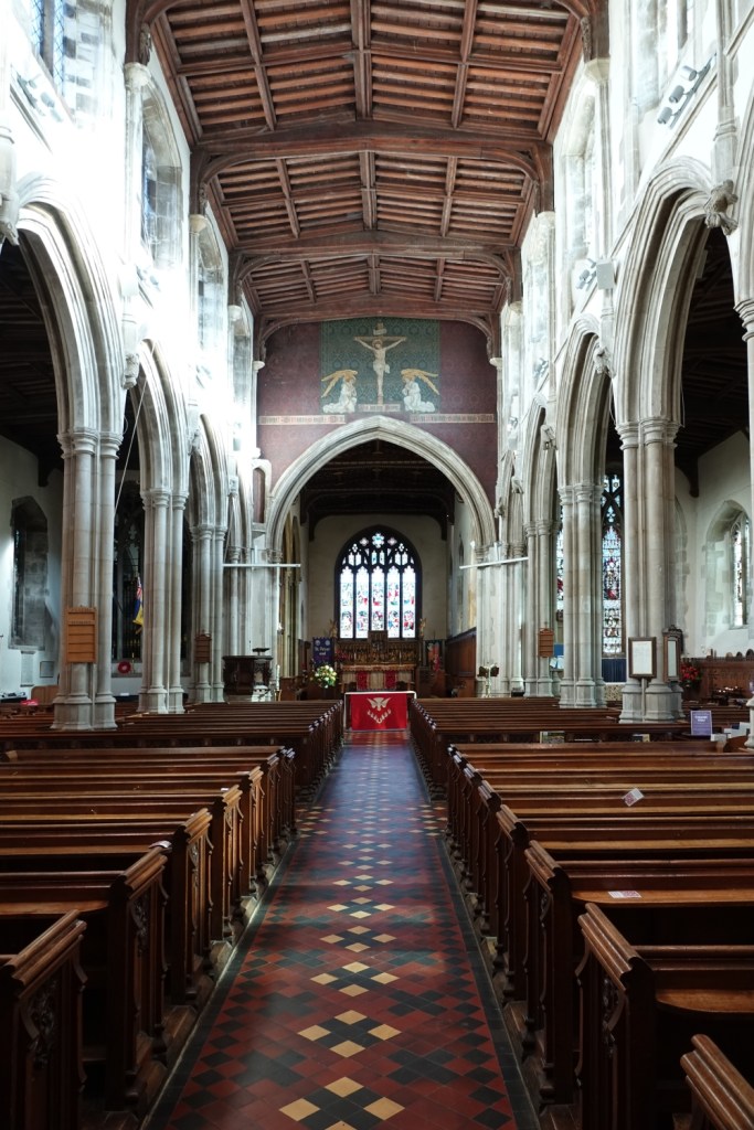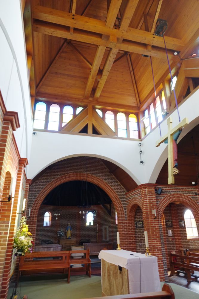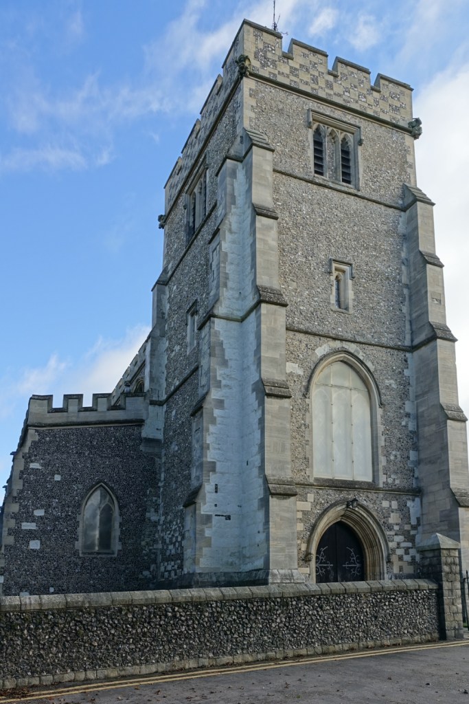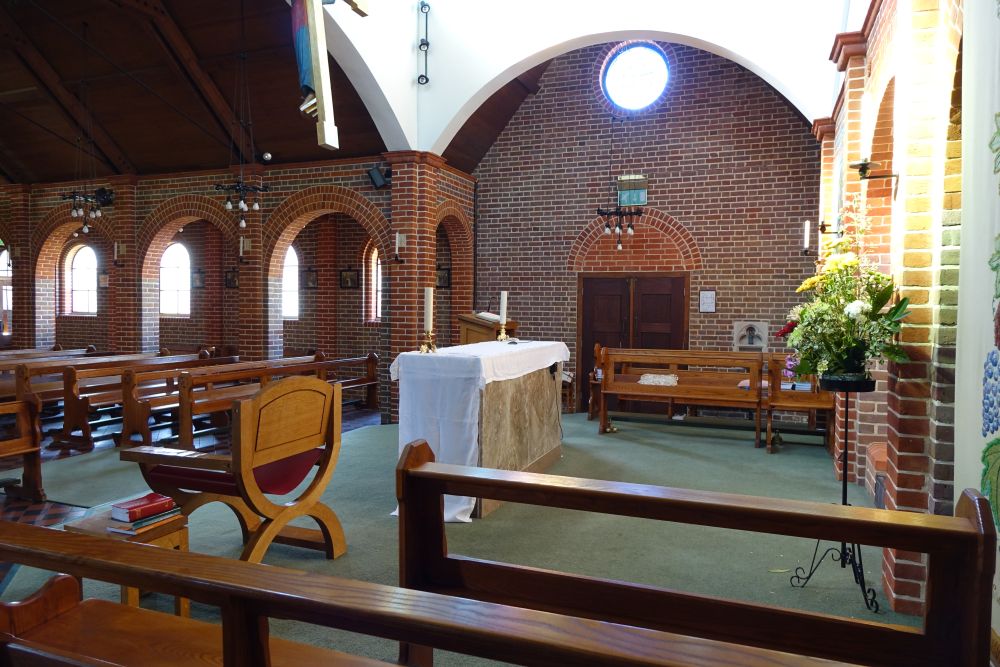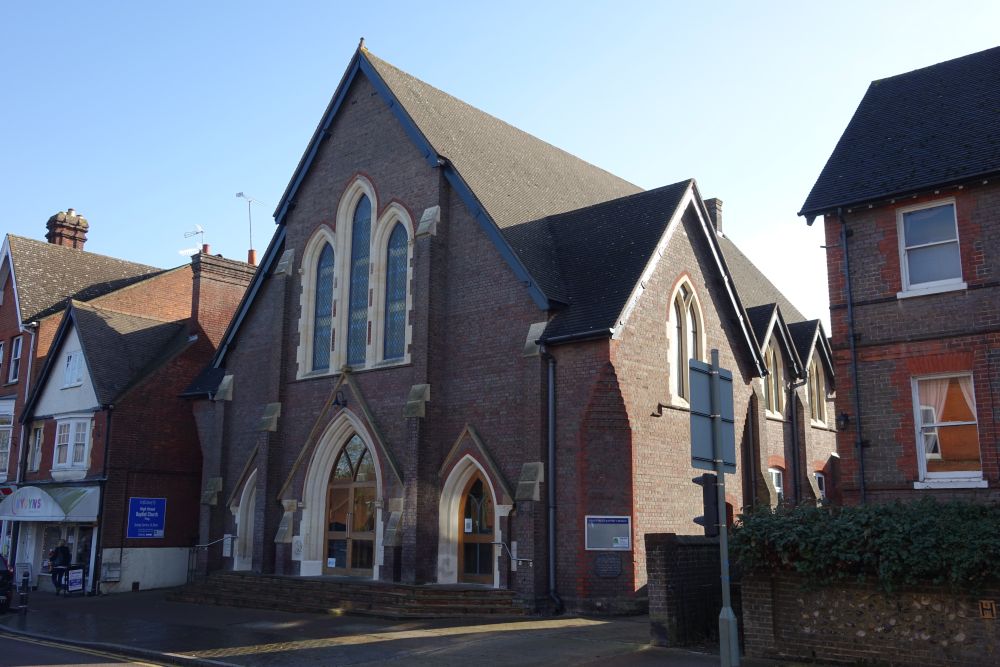 On the western edge of the town centre, the basis of the building is from 1912 and designed by a C. Green. A tower and south aisle were added in the 1960s by George Mathers. Reconstruction in 1995-99 by Anthony Delarue turned the church by 180 degrees and added a new aisle.