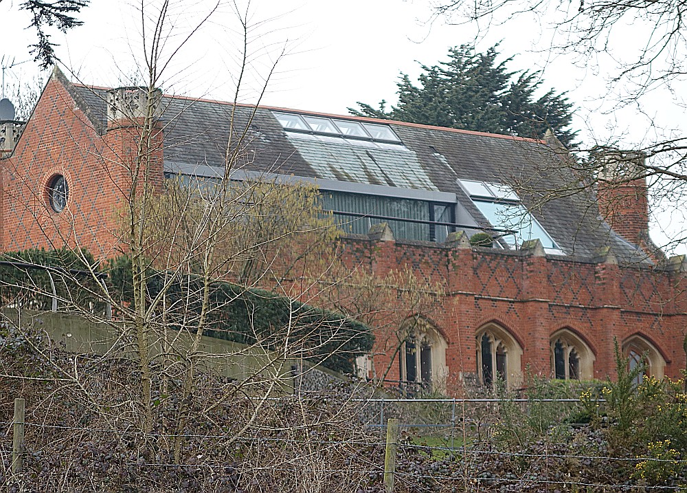 The chapel of Goldings (a house by William Devey 1870) which is a now a private house. The chapel dates from 1923 and was designed by Walter Godfrey of Wratten and Godfrey. It was built when the house became Barnado’s William Baker Technical School. In 1969 Herts County Council moved into the house and the chapel became a sports hall. The council moved out in 1999 and the chapel became part of a development of new housing around the house. In 2009 it was sold for £3.4 million. It can be seen from two public footpaths but it is not a good view.